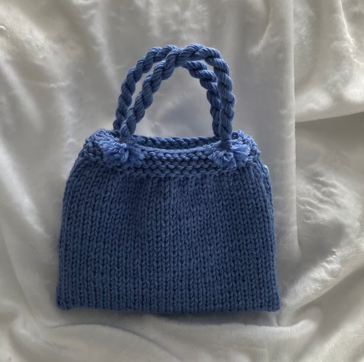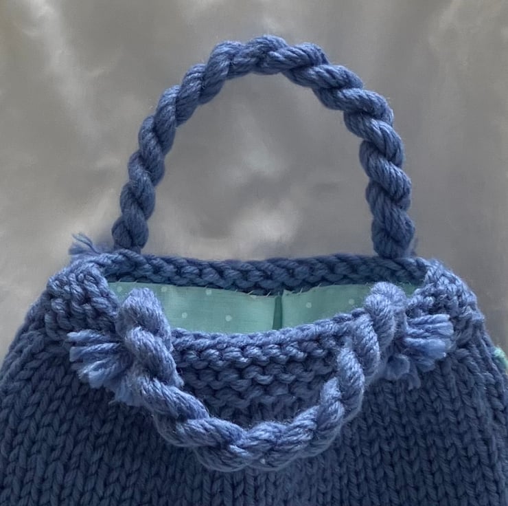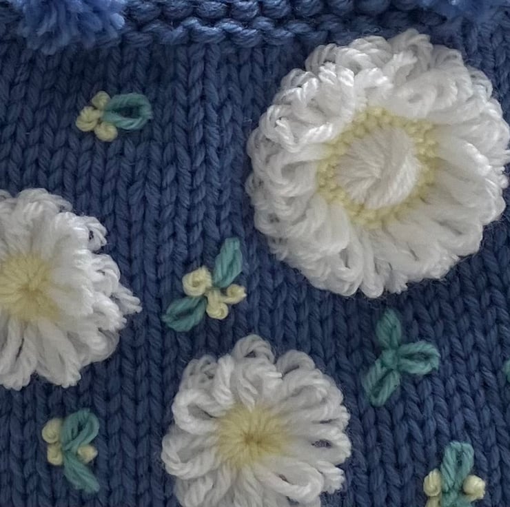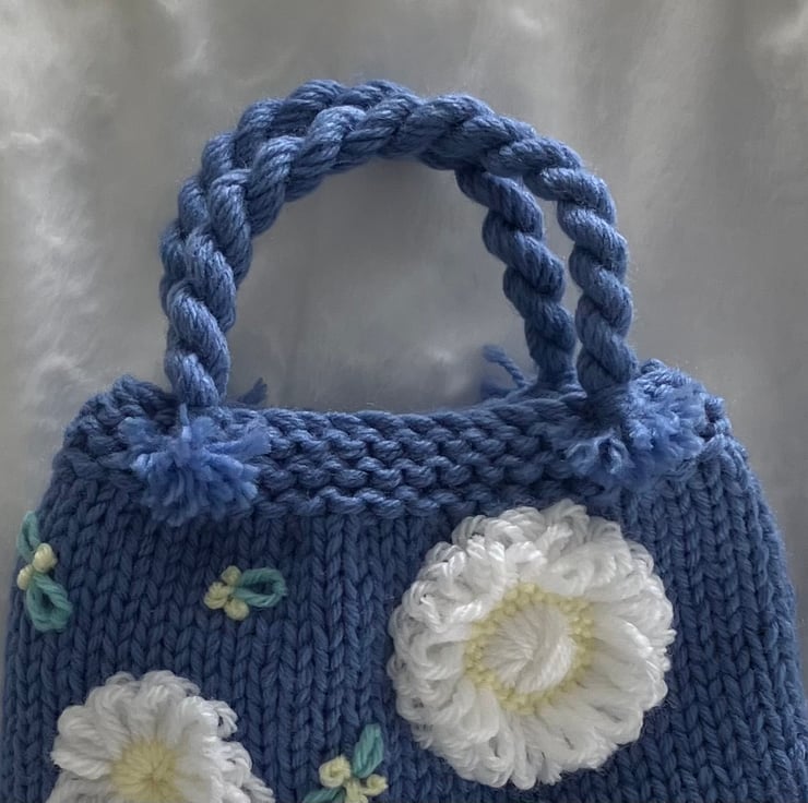 I've knitted this cute little bag in a mid blue acrylic/nylon blend yarn and decorated it with loom-made white flowers and embroidered buds and leaves in contrasting colours.