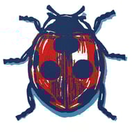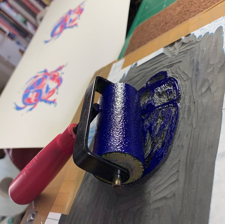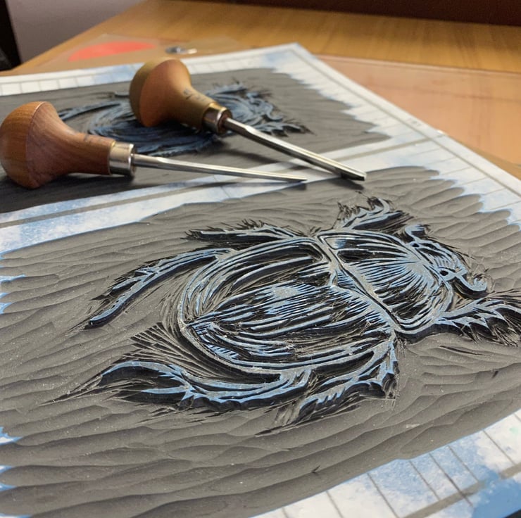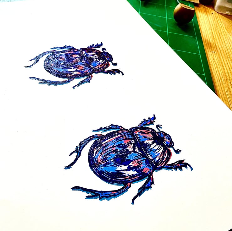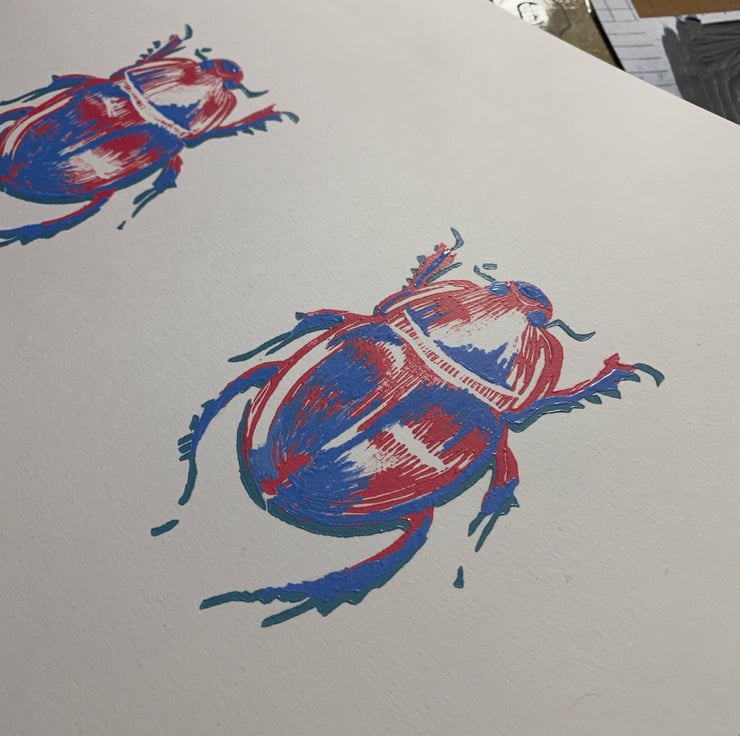 A three colour, hand printed, limited edition fine art lino of a scarab beetle. Number two in a series. The edition is limited to 30 prints, on acid free watercolour paper, using oil based relief print inks.
