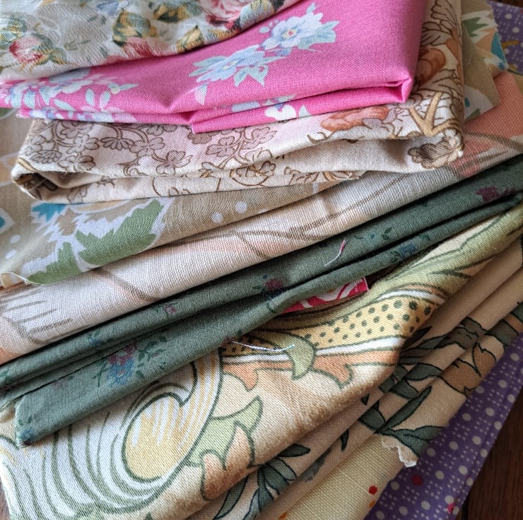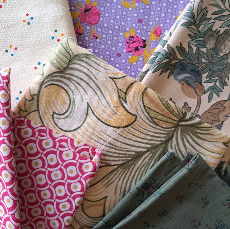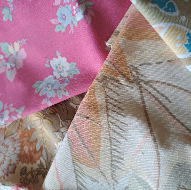 A hefty bundle of genuine vintage cottons - heaven for all you vintage fabric lovers. Eleven very good-sized pieces (the largest is a whopping 90cm by 45cm) of cotton fabric of mixed weights, including some French spots and very English Sanderson florals. In cracking condition.