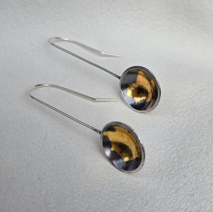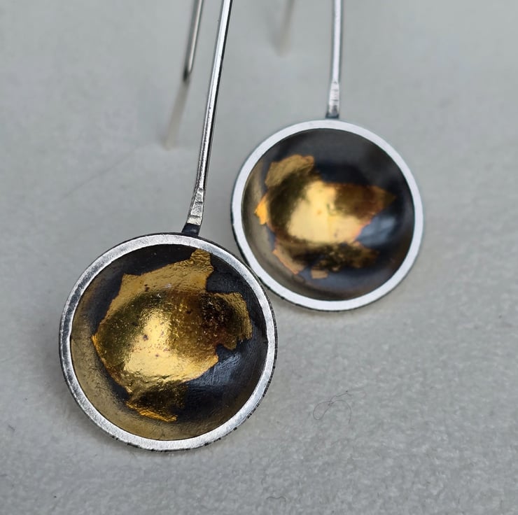 The domed discs are 1.7 cm in diameter at its widest. They have beautiful accents of gold inside, and have been oxidised to a dark grey to bring out and enhance the contrast between the silver and gold. The edges of the discs have been polished back to a metallic silver, making the contrast even more striking. These drops feature a handmade ear hook wire. When worn, they are extremely comfortable, yet the weight of them is enough to make them swing as you move, making them catch the light and sparkle in gold and silver.