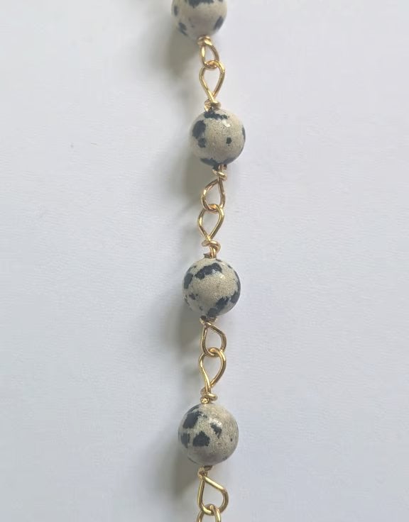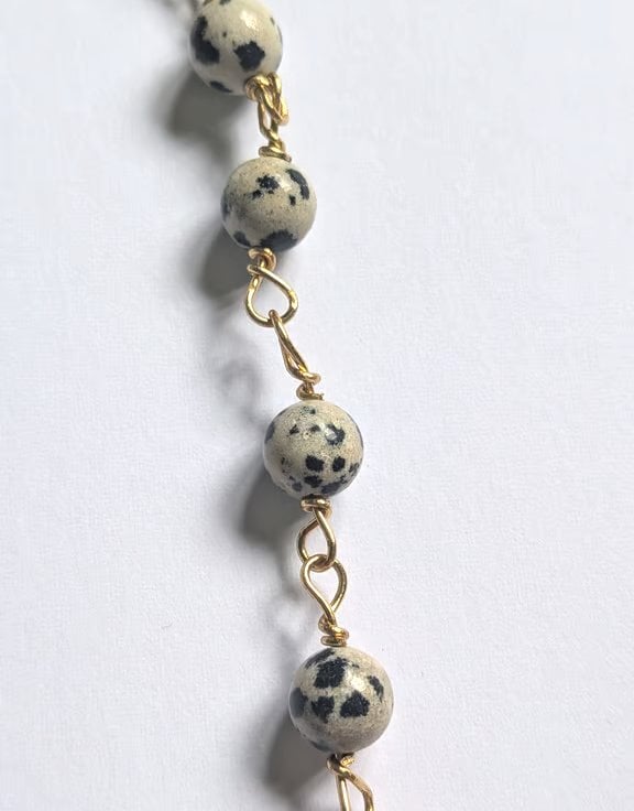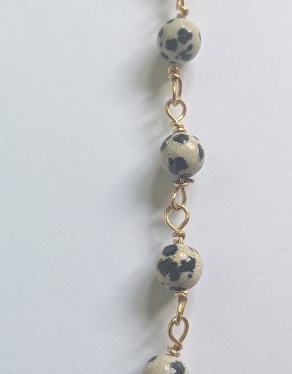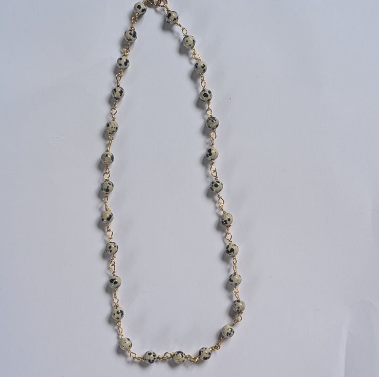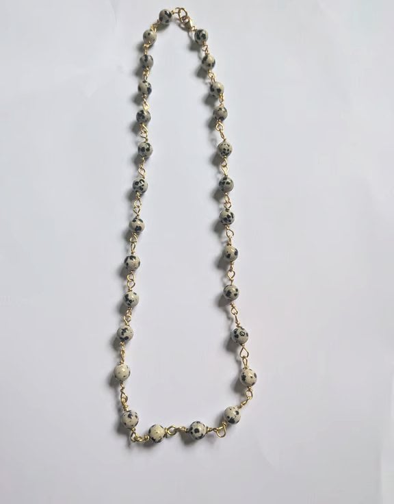 This is a semi precious necklace made from beautiful dalmatian jasper beads strung together with brass wire and finished with a simple gold filled clasp. The beads measure approximately 6mm and the necklace is around 17.5 inches long.