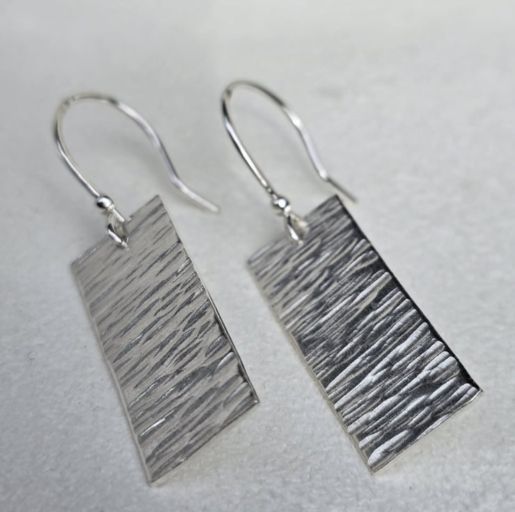 These rectangular dangling earrings are around 1 cm wide by 2.7 cm long. They have been individually sawn by hand, then hammered and filed to add the rippling textured effect, and finished with sterling silver, handmade ear hook wires. These earrings are light enough to be worn very comfortably, yet weighty enough to swing as you move, catching the light and sparkling like moving water, reminiscent of the sun shinning over small ripples on a pond or the sea.