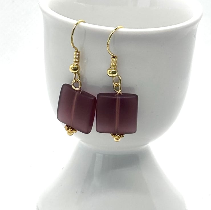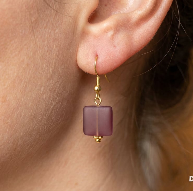 These handmade earrings feature frosted glass square beads in a muted Mocha shade, paired with gold-plated sterling silver ear wires for a timeless finish. The matte texture catches the light beautifully, giving just the right touch of understated glow.