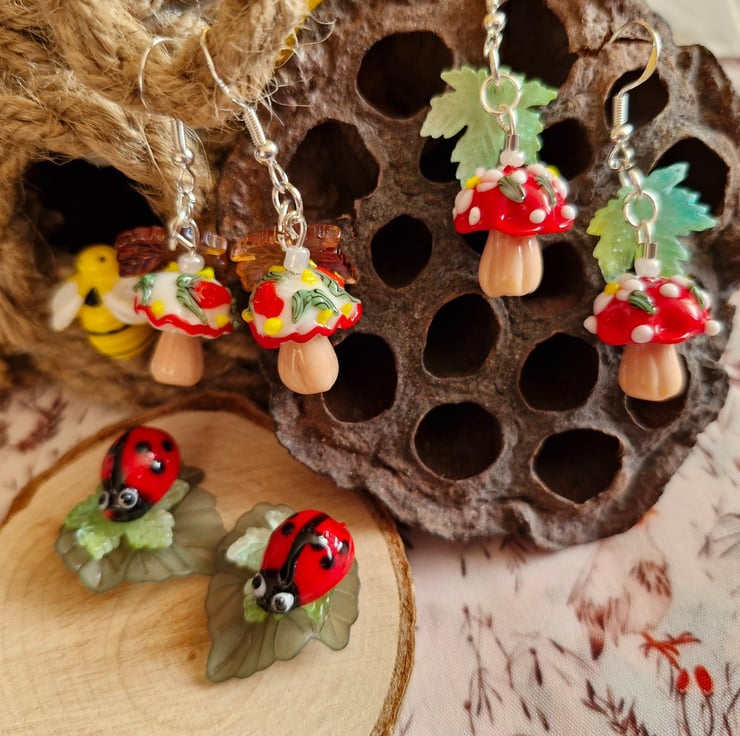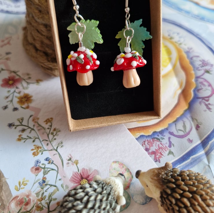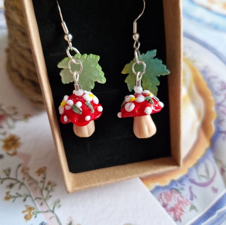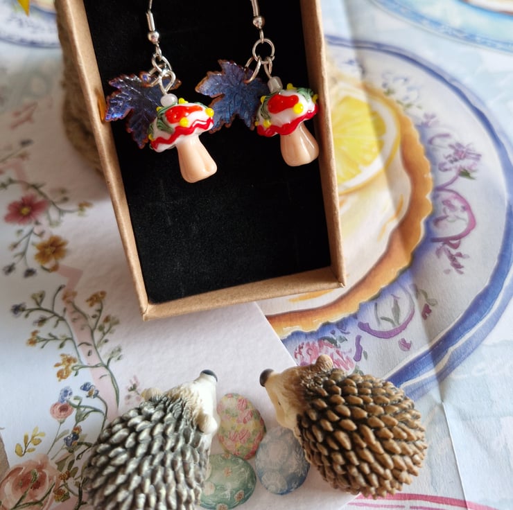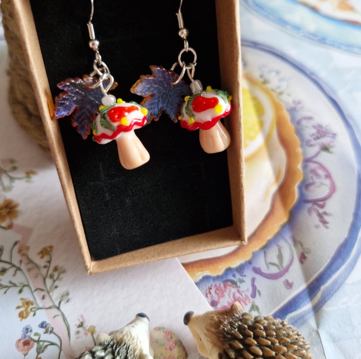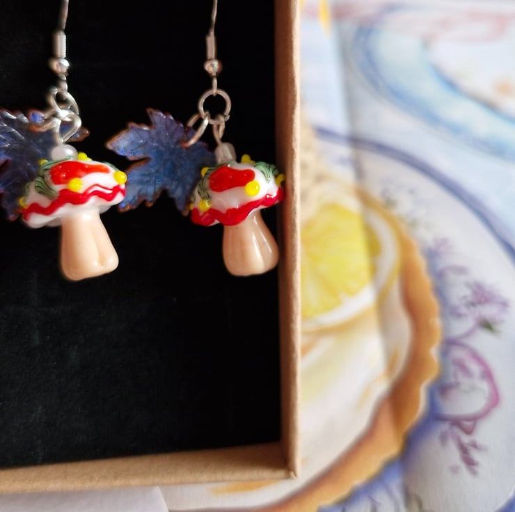 Capture the magic of the forest floor with these vibrant, detailed danglers. miniature red-capped toadstools with white spotted details, paired with translucent, shimmering purple or green leaves. These are known as the "Spirit Weaver Seats", Where the keepers of the library rest during the autumn equinox. These earrings have Stirling silver ear hooks and arrive in a lovely recycled gift box.
