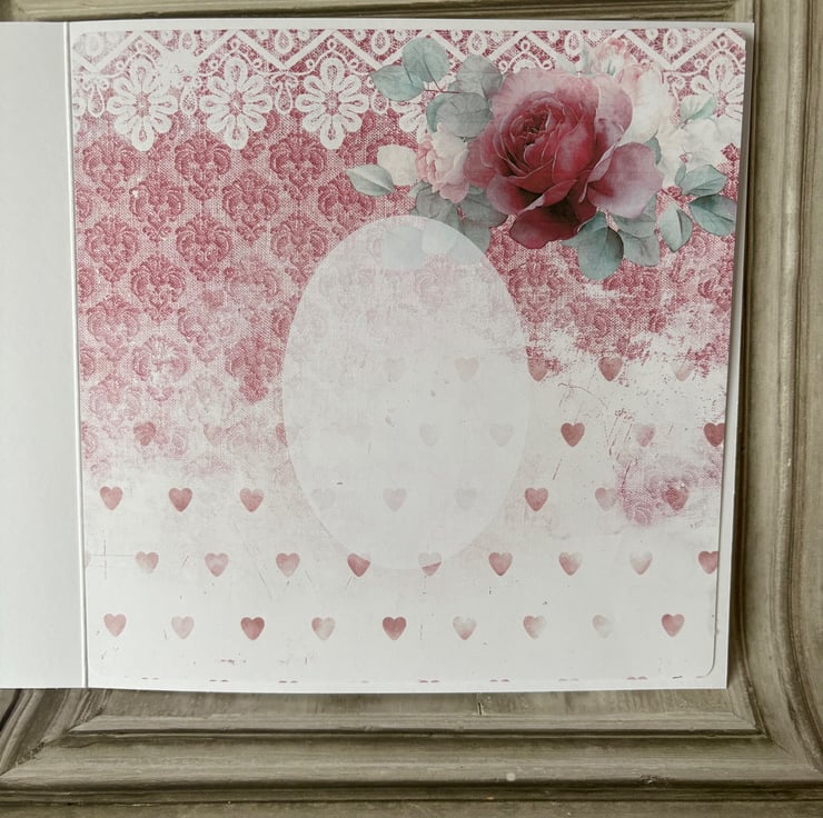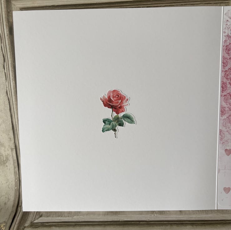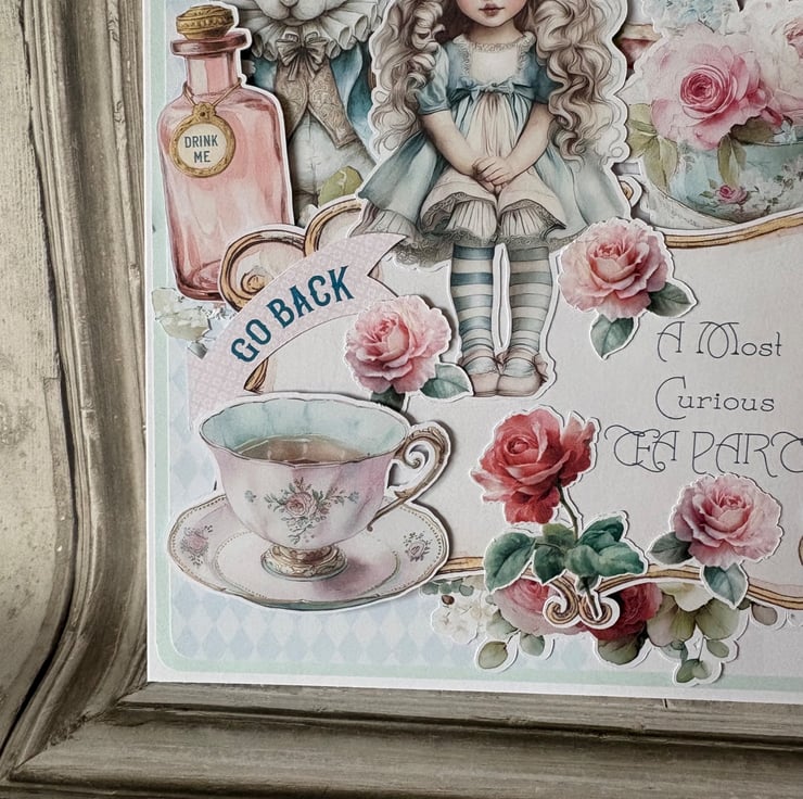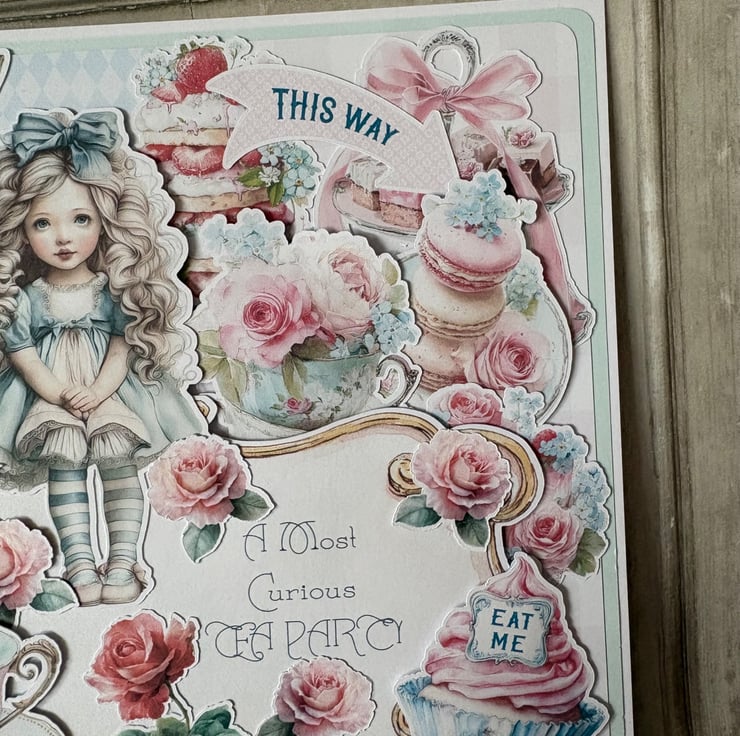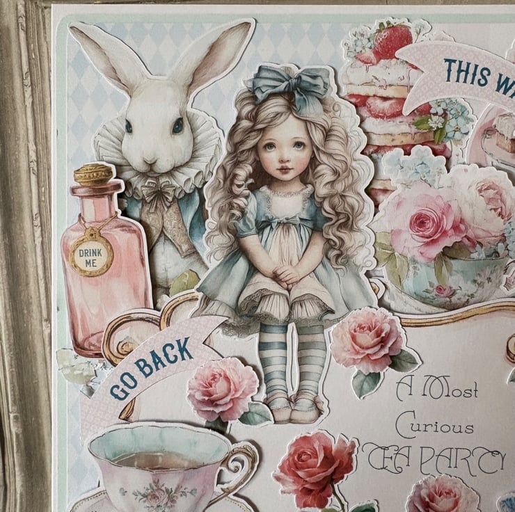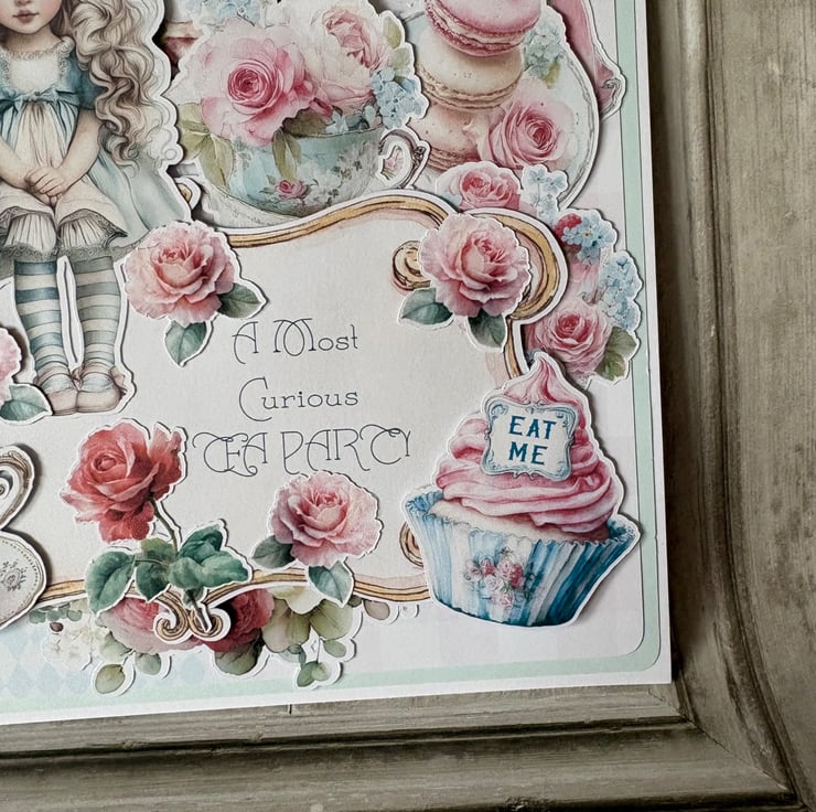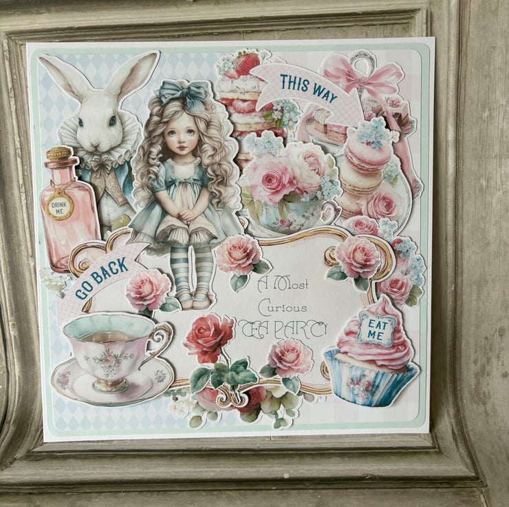 8" x 8' white card and envelope. Blue card with a harlequin and gingham backing paper in blue and pink. Topped with fussy cut characters, cakes, flowers and teacups. Main message reads 'A Most Curious Tea Party'. Rose fussy cut on the inner page with a printed design with white oval for your own message.