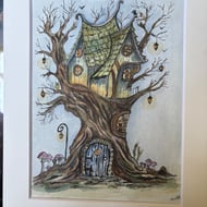 Bring a touch of storybook magic to your home with this charming, folksy original watercolour of a whimsical cottage under a glowing full moon. Full of character and cosy detail, this piece feels like it's straight out of a fairy tale-complete with wonky beams, glowing windows, and tiny toadstools nestled in the garden.