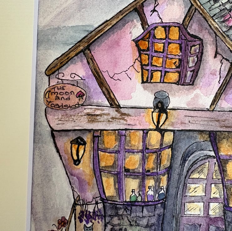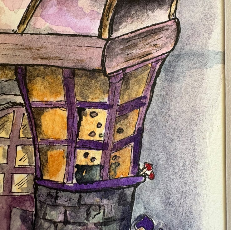 Painted in soft purples, greys, and warm golden tones, the cottage has a gently crooked, enchanted feel, with delicate ink outlines adding texture and personality. Look closely and you'll spot sweet little details-bottles in the window, hanging herbs, and a curious cat keeping watch. Original watercolour painting (not a print)