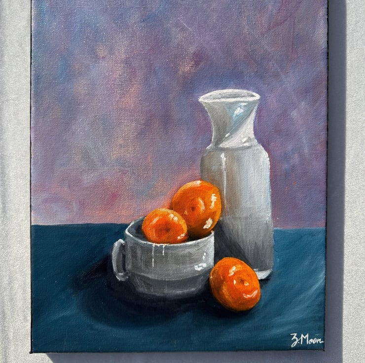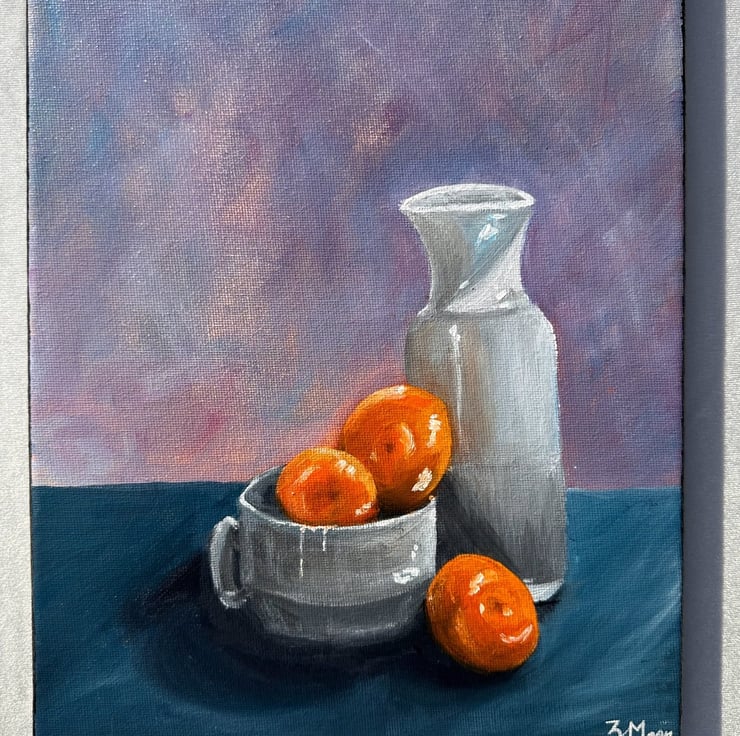 A 30cm x 23cm (12in x 9in) acrylic on canvas painting of a still life done while teaching a painting workshop for a community youth group.