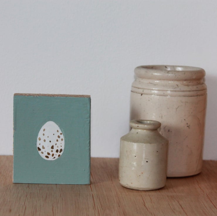This is an original painting of a blue tit egg on reclaimed plywood. It has been painted in acrylics and sealed with a thin protective coat of matt varnish.