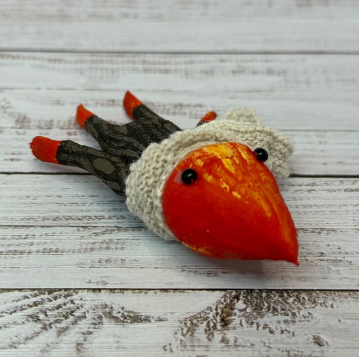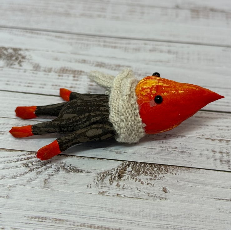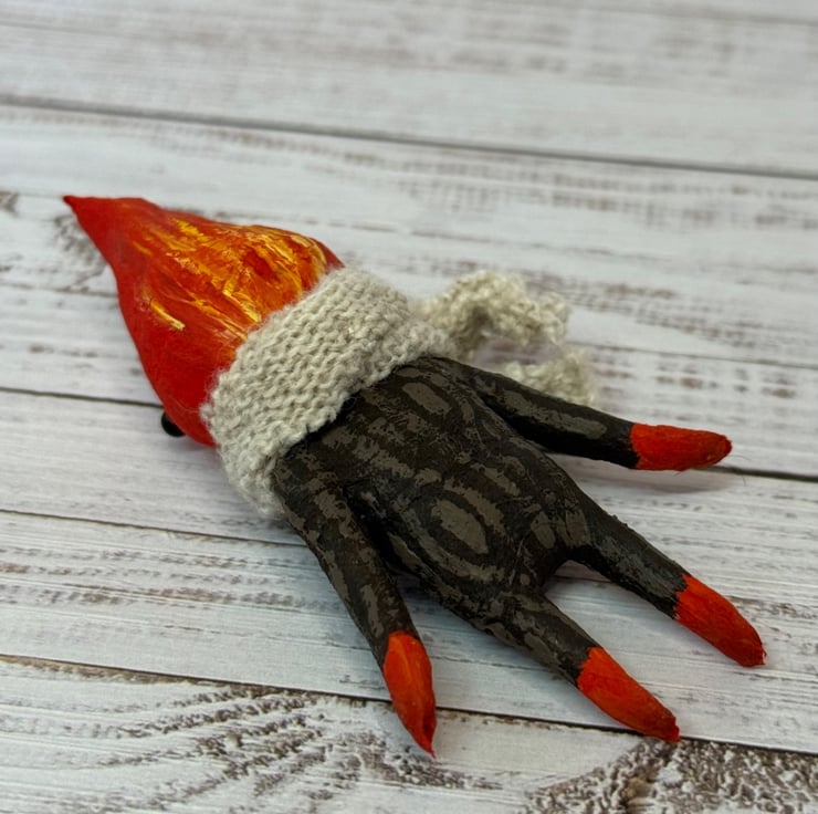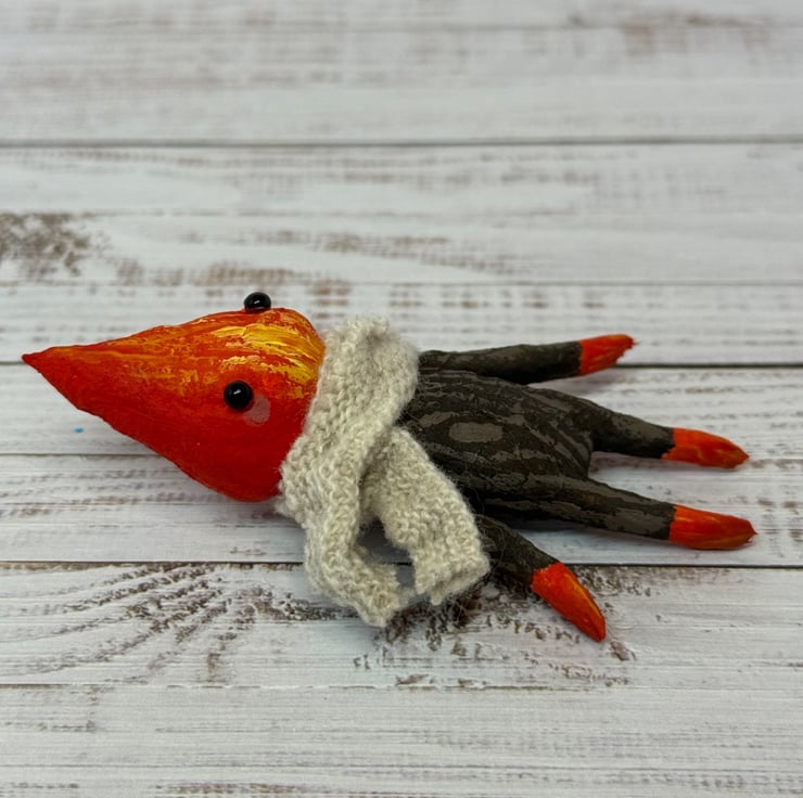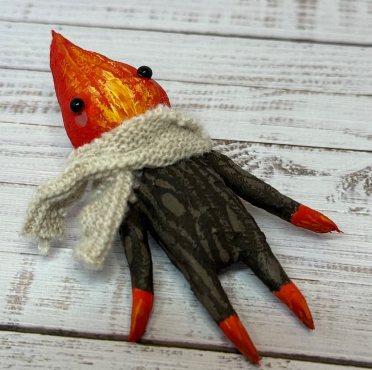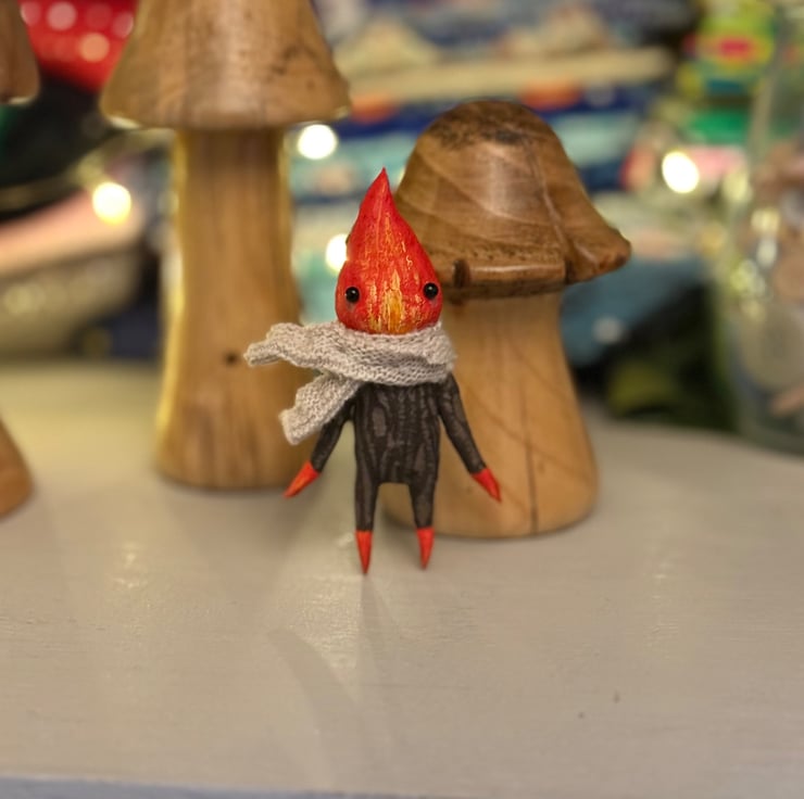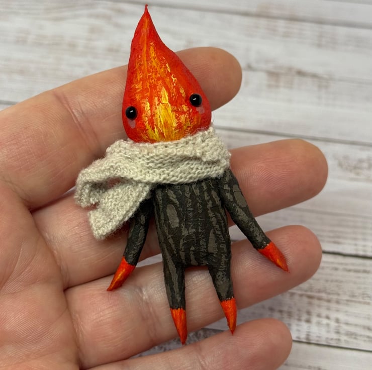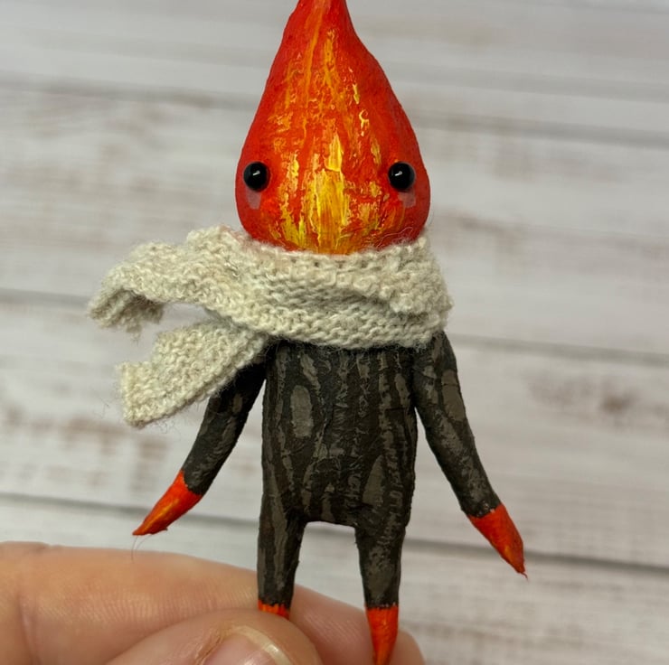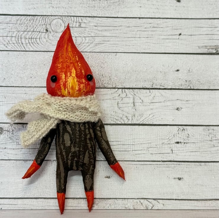 Made from spun cotton with internal wire frame. Measures roughly 8.5cm tall with glass bead eyes. Doll is completely hand painted with flame head and wood look body. Spirit wears an upcycled fabric scarf hand stitched into place. Measures roughly cm tall.