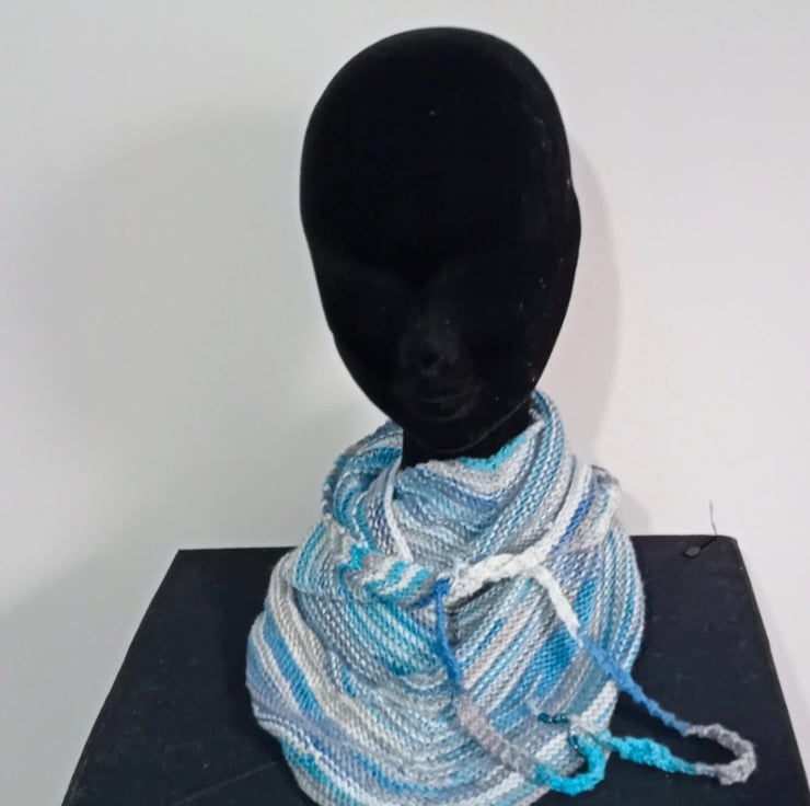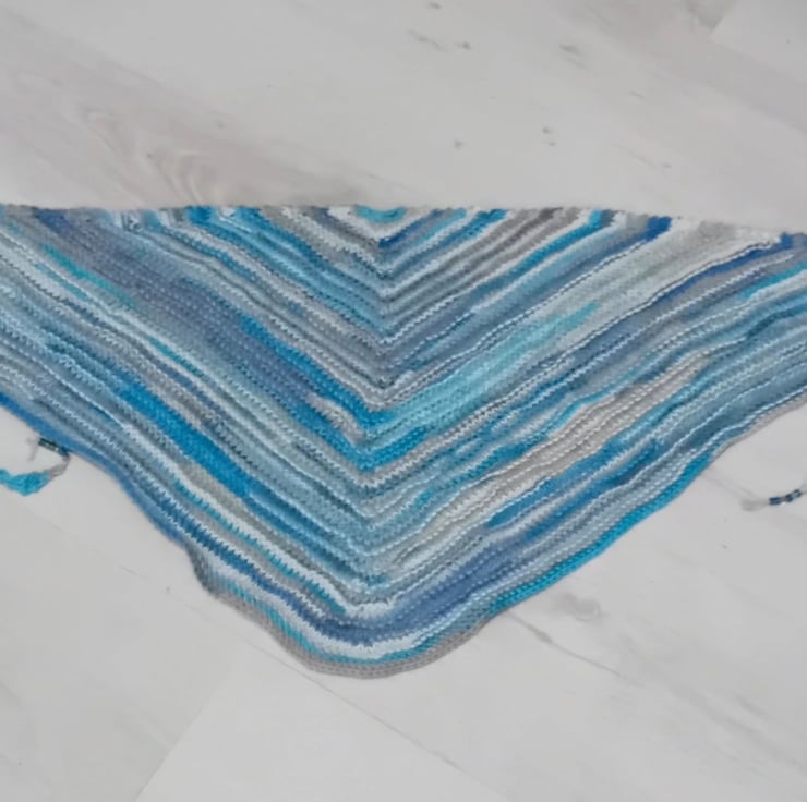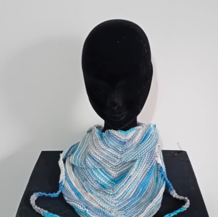 Triangular handknitted neck scarf in random yarn in blues greys and white. The scarf is mixed fibre of acrylic, wool and cotton. Soft and comfortable suitable for any season.