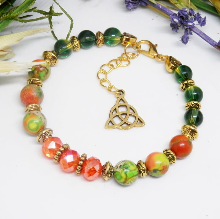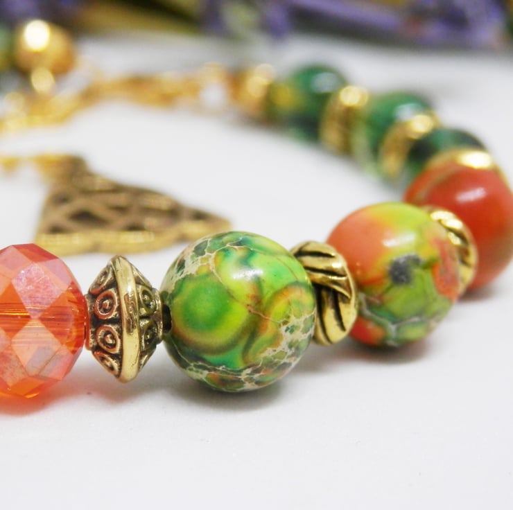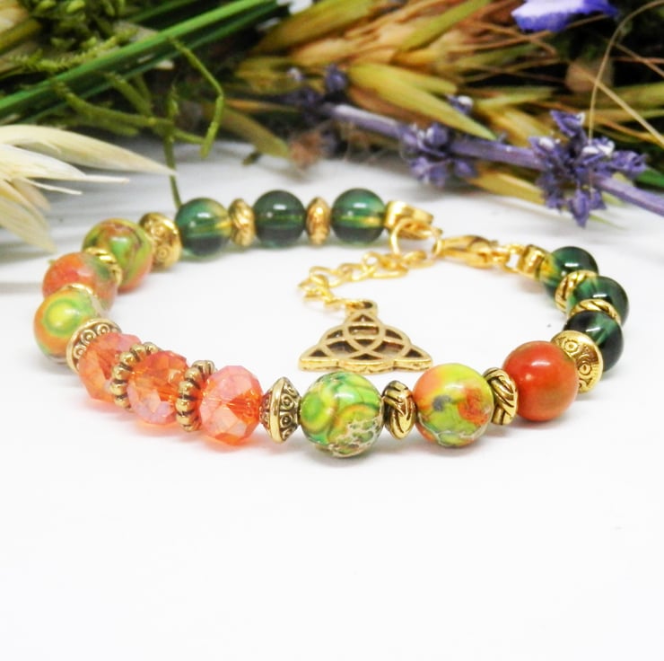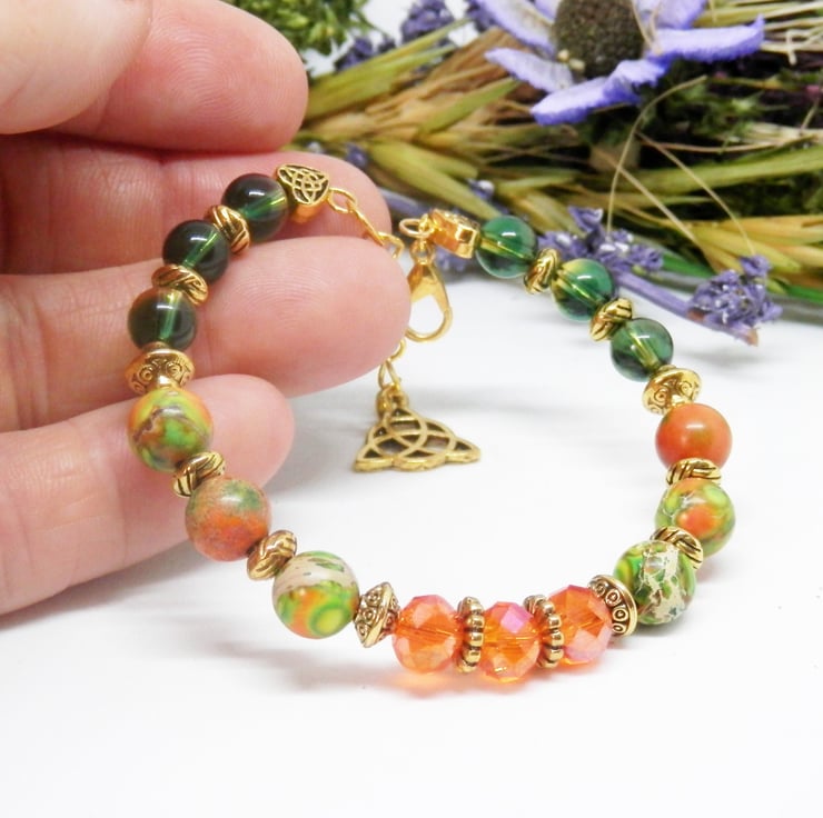 Here we have a fabulous Memory Wire Bracelet made using gold plated Memory Wire that holds it's shape. Adorned with lovely faceted orange glass beads, green glass beads and beautiful sediment Jasper beads, along with gold coloured spacers with celtic patterns.