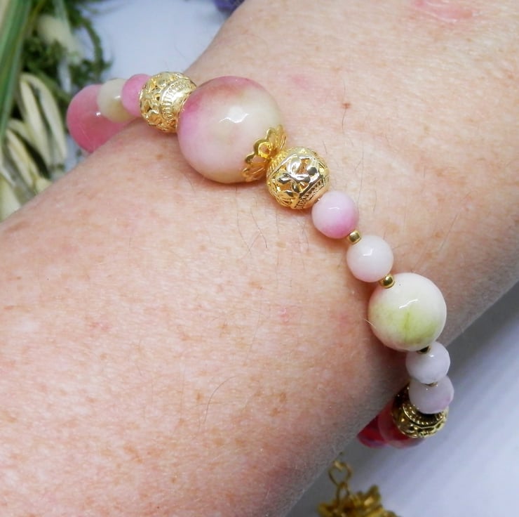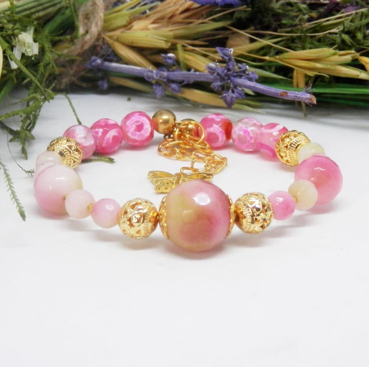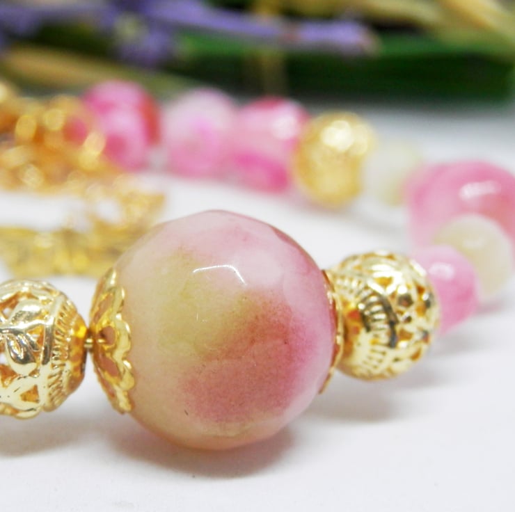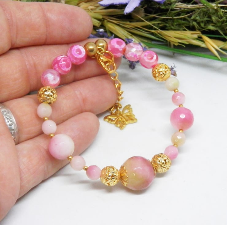 Here we have a gorgeous Memory Wire Bracelet made using gold plated Memory Wire that holds it's shape. Adorned with a lovely variety of Pink Agate beads, gold plated spacers and gold coloured patterned beads.