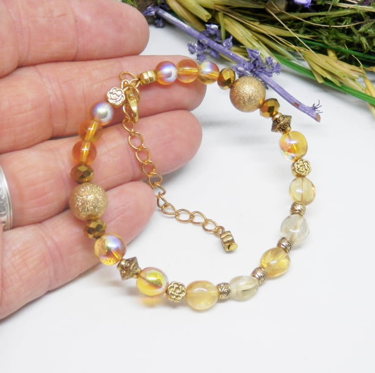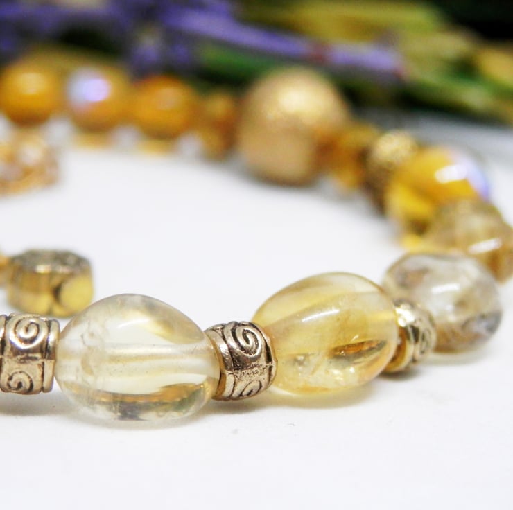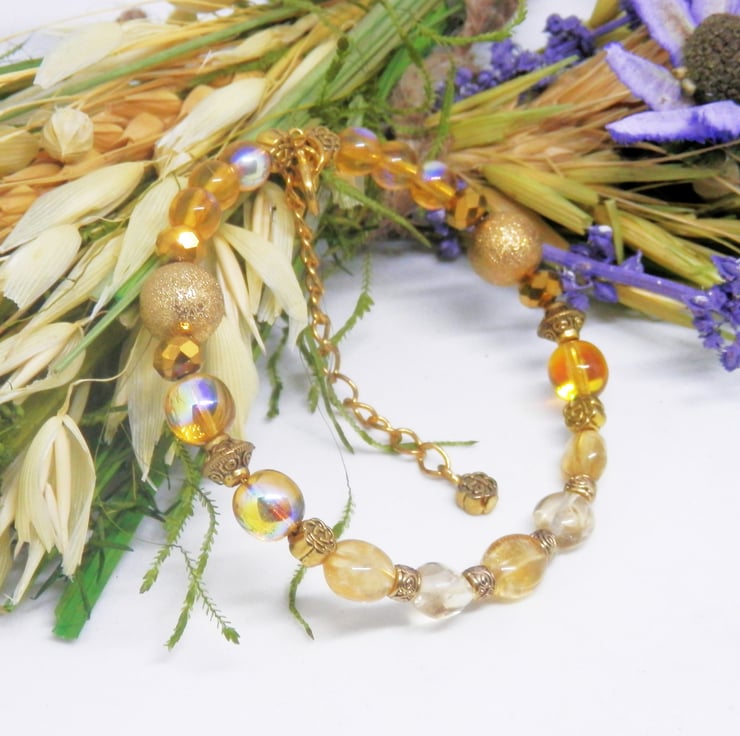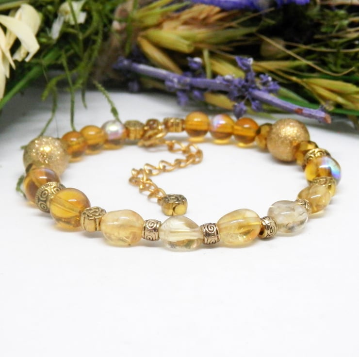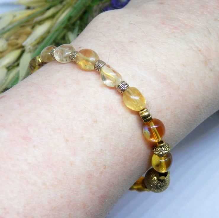 Here we have a gorgeous Memory Wire Bracelet made using gold plated Memory Wire that holds it's shape. Adorned with a lovely variety of yellow Citrine beads, gold stardust beads, faceted gold acrylic beads, gold plated spacers and gold coloured Celtic patterned beads.
