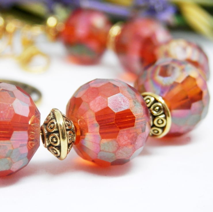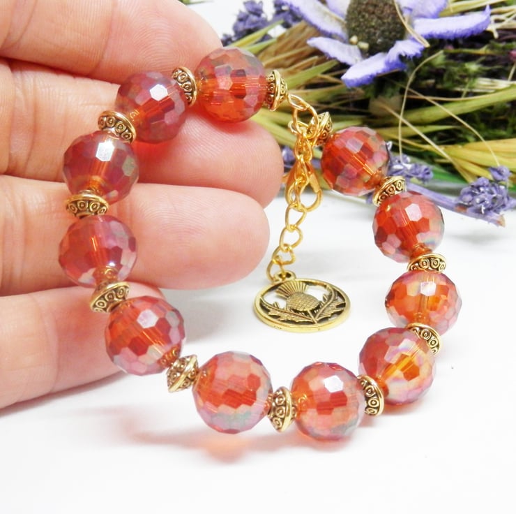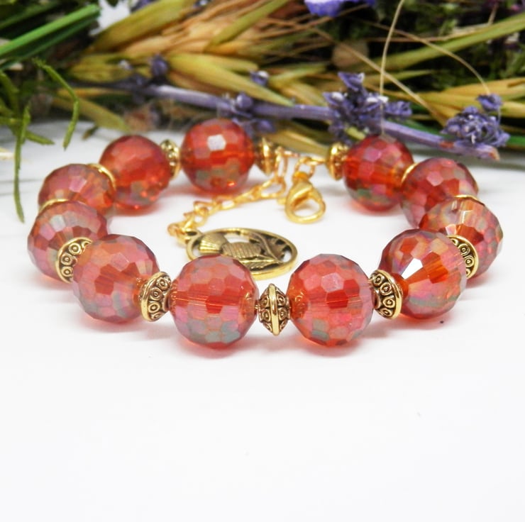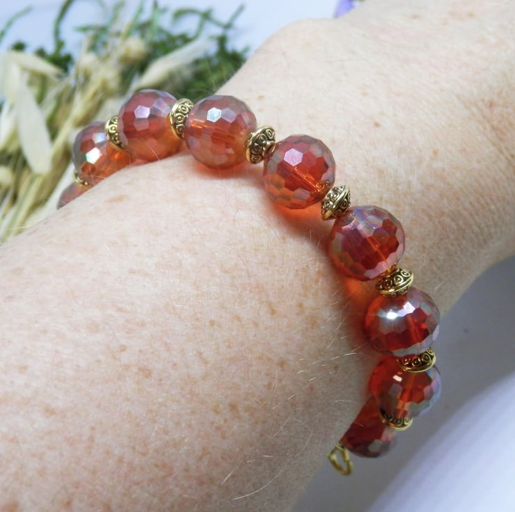 Here we have a fabulous Memory Wire Bracelet made using gold plated Memory Wire that holds it's shape. Adorned with lovely faceted orange glass beads, and metal gold coloured spacers with celtic patterns.