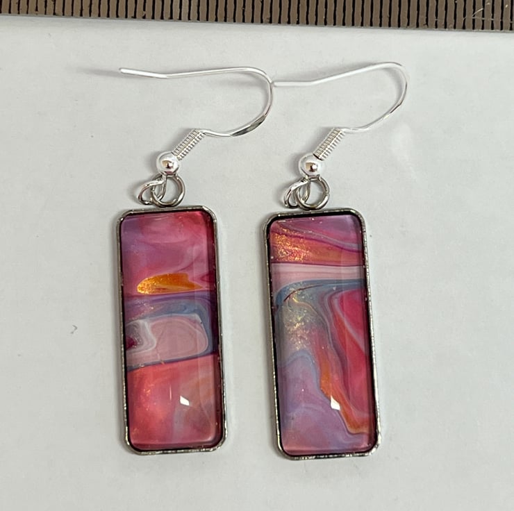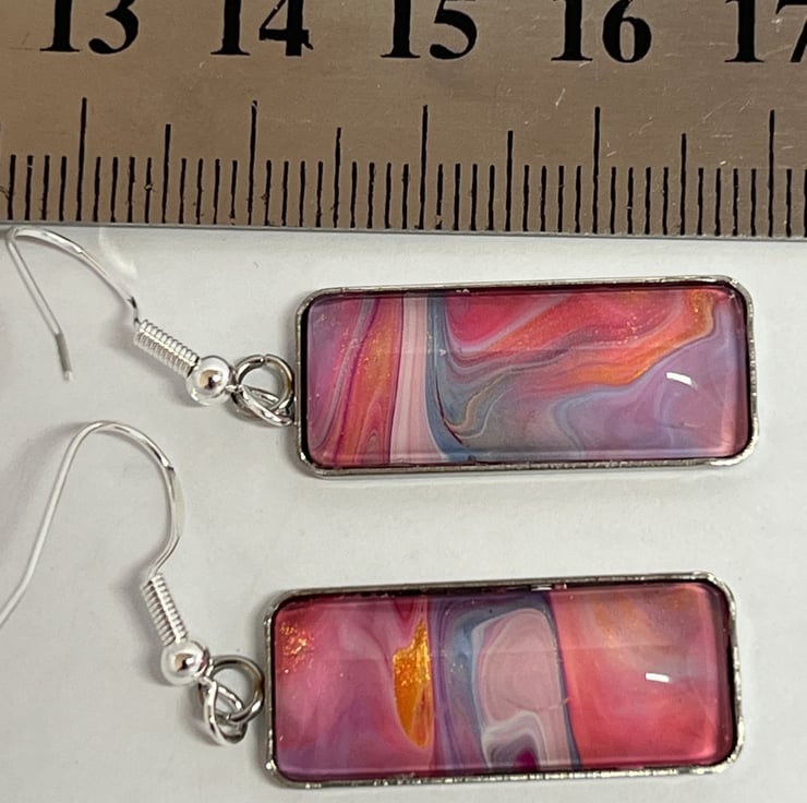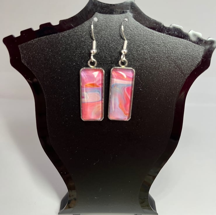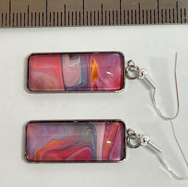 These individual painted oblong shaped earrings have been created by acrylic fluid painting, and are set in a stainless steel setting, under a glass cabochon.