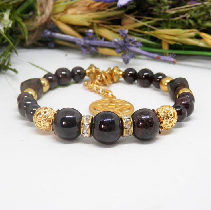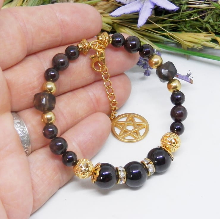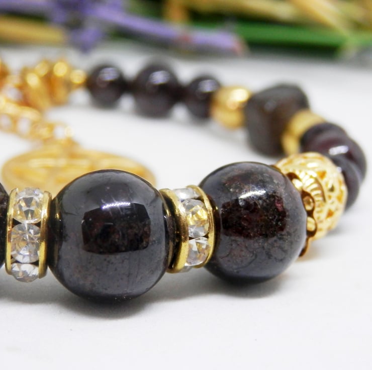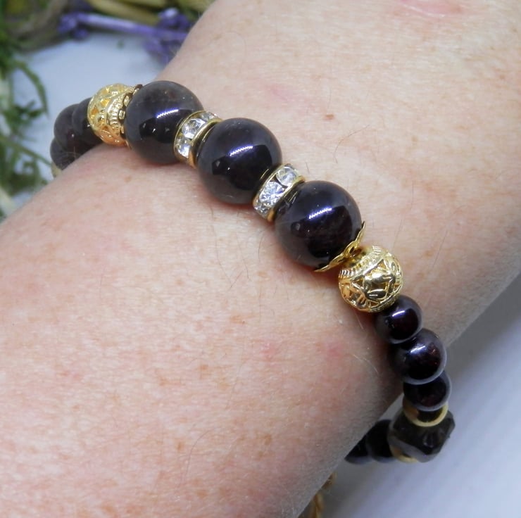 Here we have a gorgeous Memory Wire Bracelet made using gold plated Memory Wire that holds it's shape. Adorned with the deepest darkest Garnet beads in various sizes, gold plated spacer beads and faceted cube shaped smoky quartz beads, with diamante spacers and celtic patterned metal beads.