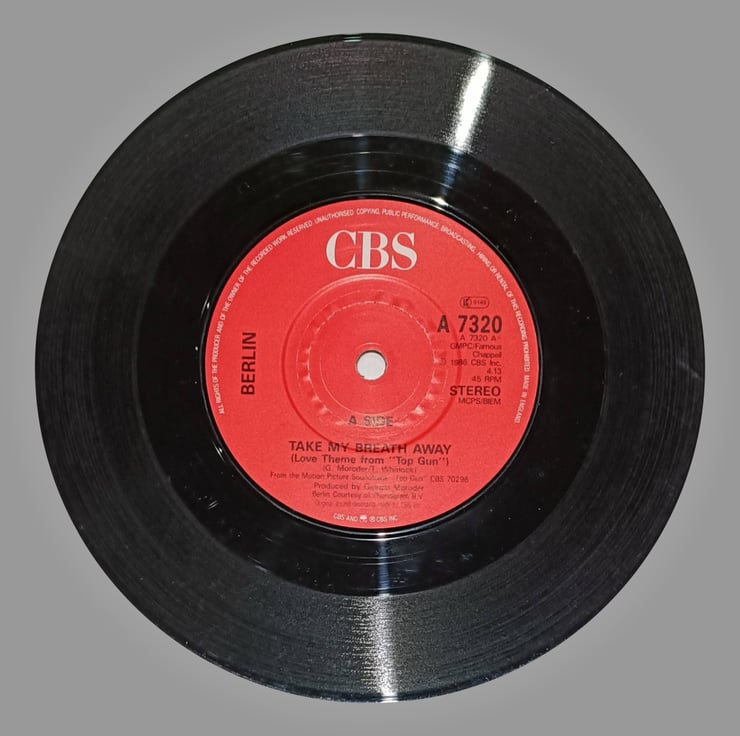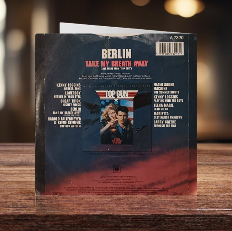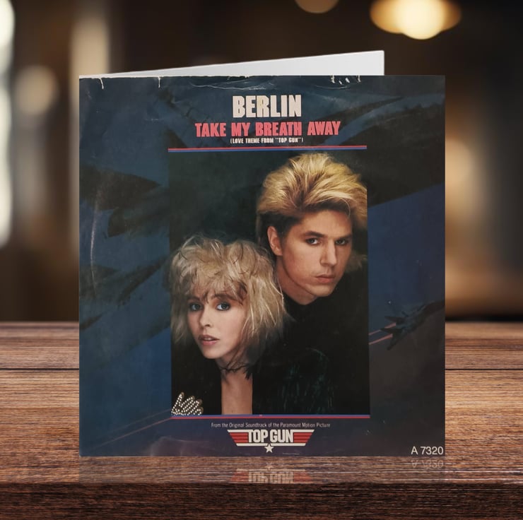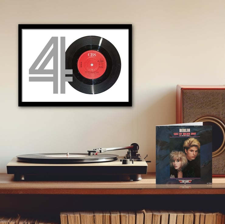 This piece features the UK No.1 single Take My Breath Away by Berlin, which topped the charts from 2nd to 29th November 1986. It makes a standout milestone gift for anyone turning 40, and it is especially perfect for fans of Top Gun, Berlin, or classic 80s pop.