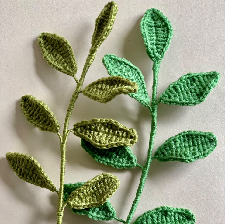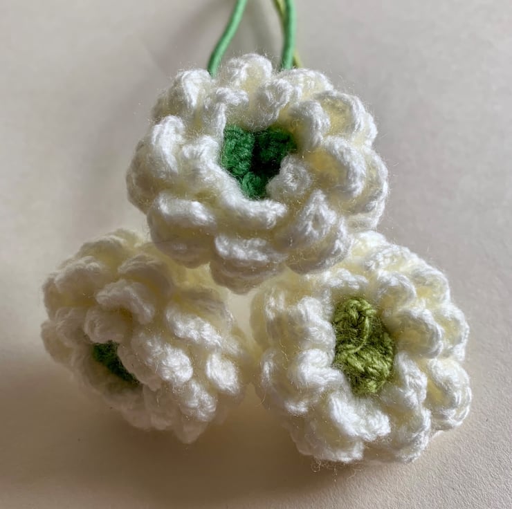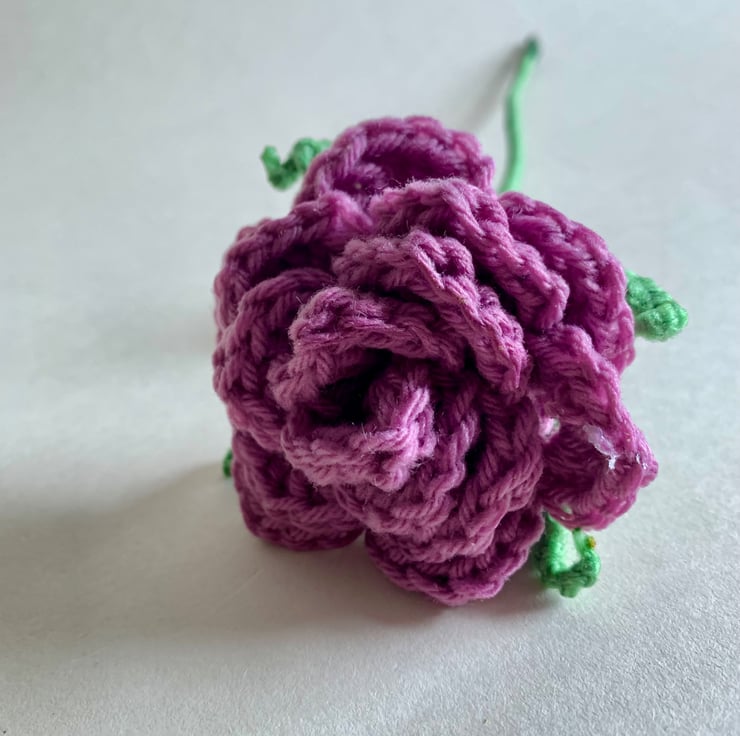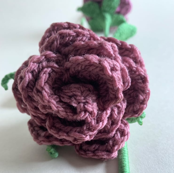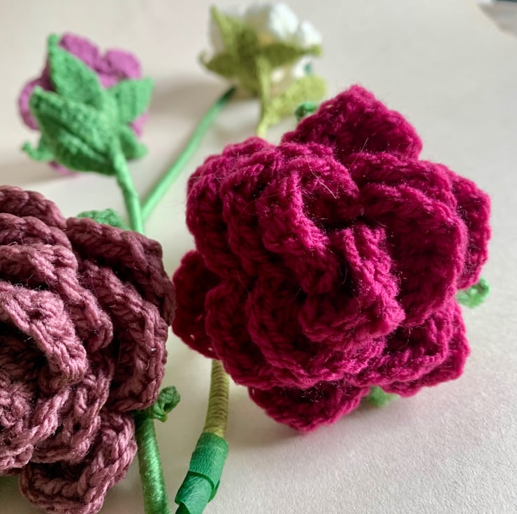 All the flowers and leaves are hand crocheted using acrylic yarn. The bouquet consists of four crochet roses, three ranunculus and three stems of leaf foliage, making a bouquet to last forever.