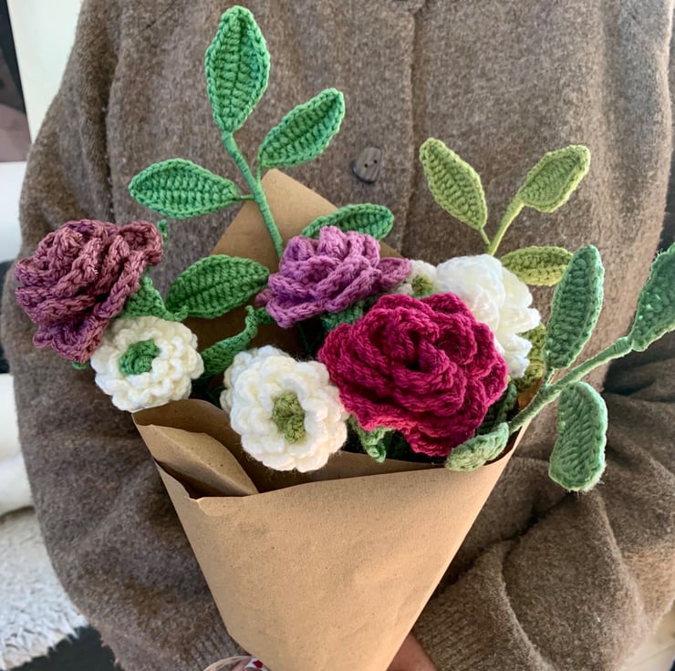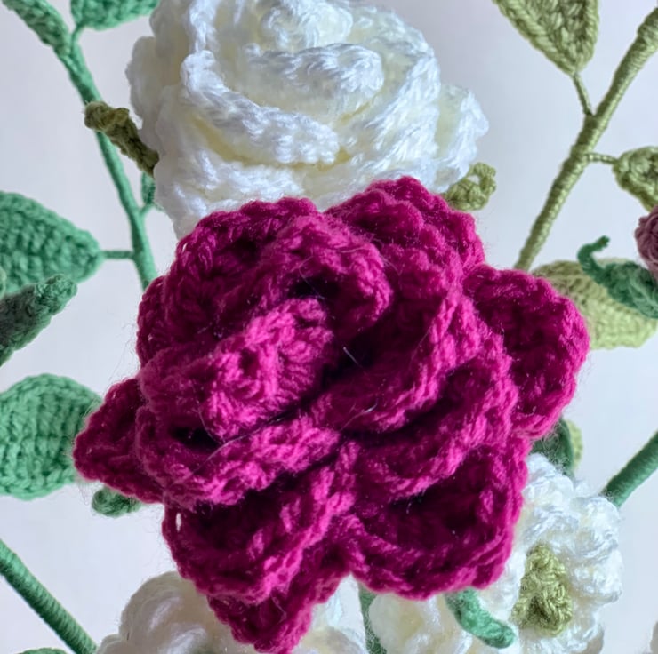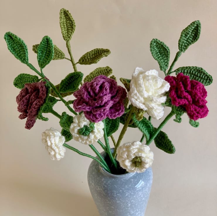 This beautiful crochet flower bouquet brings antique roses, ranunculus and foliage together to create a unique display that can be gifted or kept as a decoration for your own home.