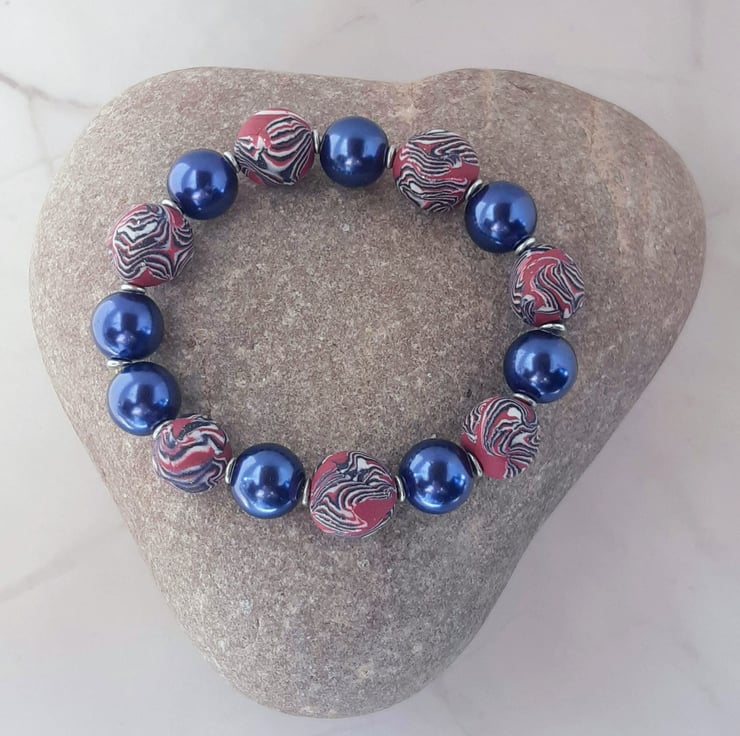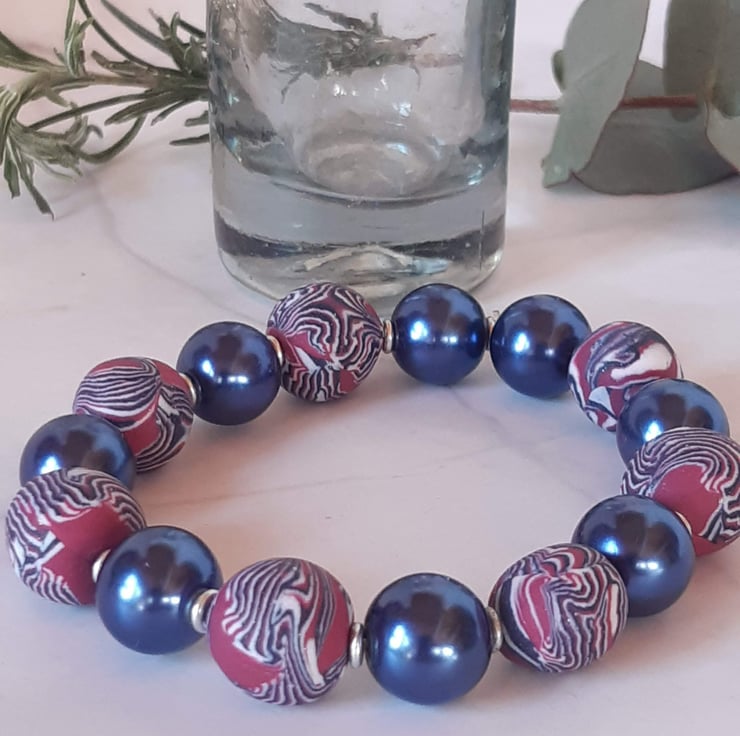 This distinctive handmade bracelet features a mix of dark magenta, navy and white polymer clay in a unique swirl design.
