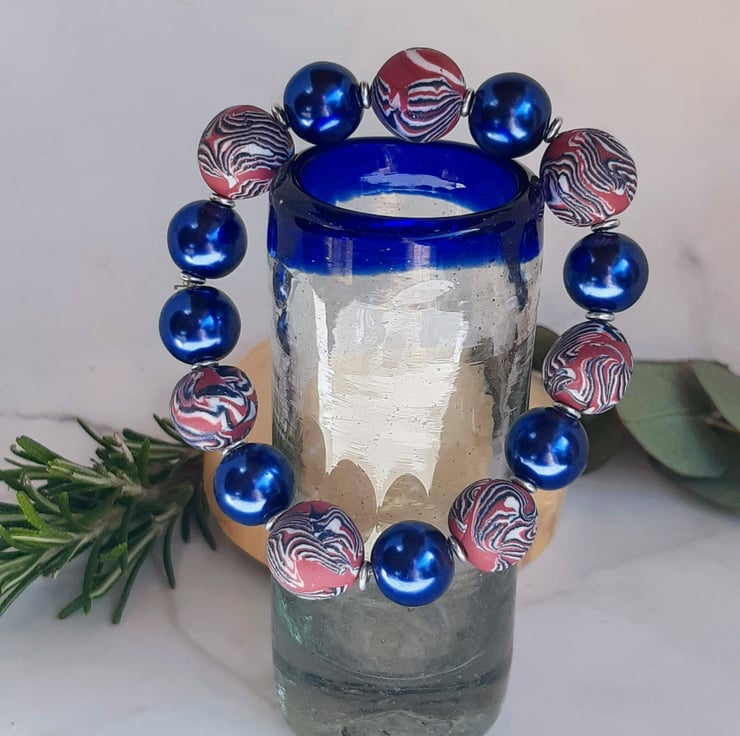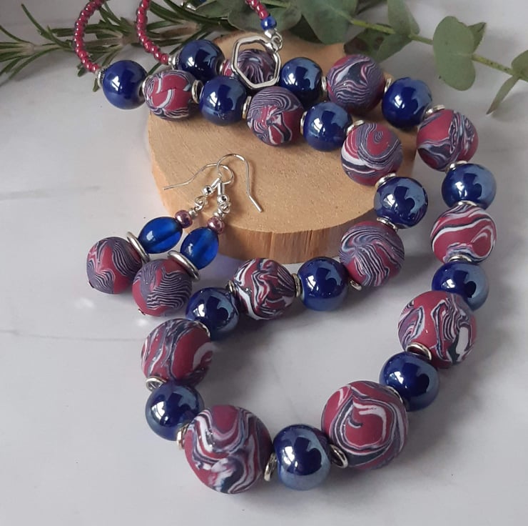 The handmade polymer clay beads measure between 12.3mm and 13mm and are paired with 12mm shiny navy round beads and tiny silver plated silver spacer