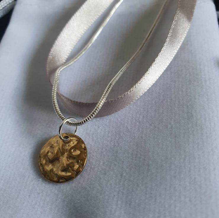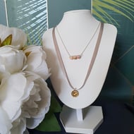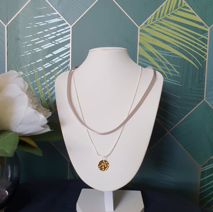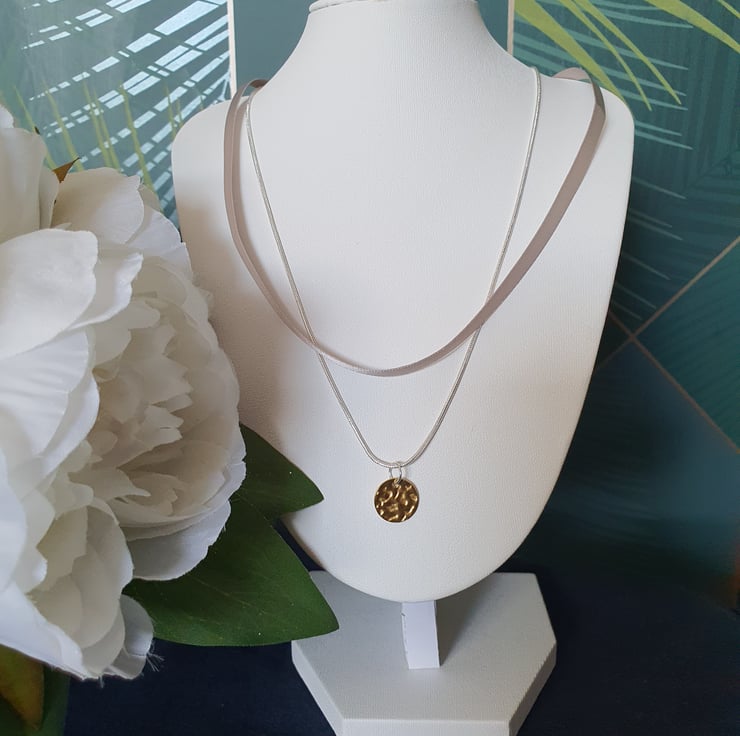 I just love the colour of this ribbon. It's so soft and beautiful. Combined with a 925 sterling silver chain and Stainless Steel hammered gold plated disc it makes a beautifully feminine and stylish statement.