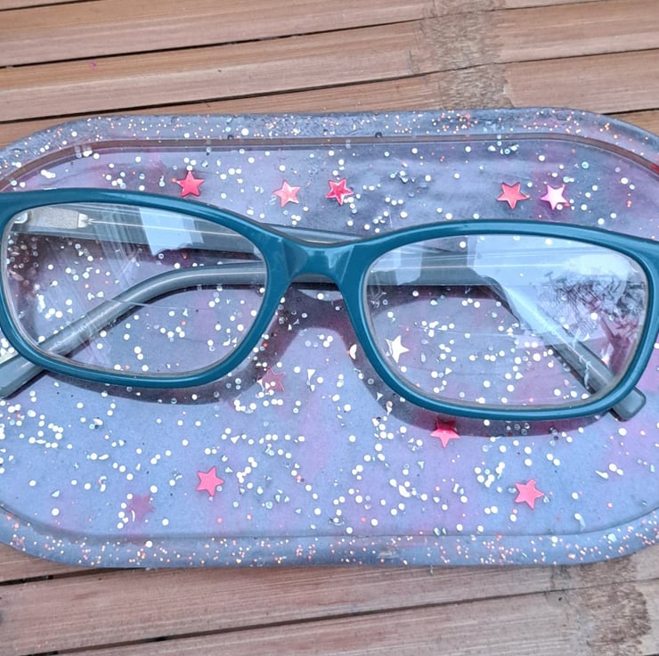 Handmade resin tray, each tray is made by adding resin to a mould. Then decoration can be added.