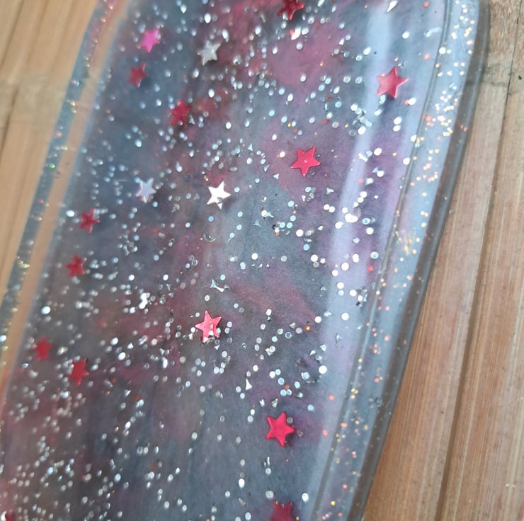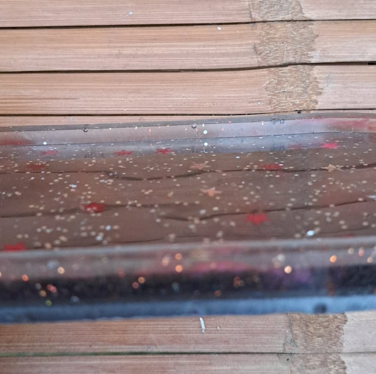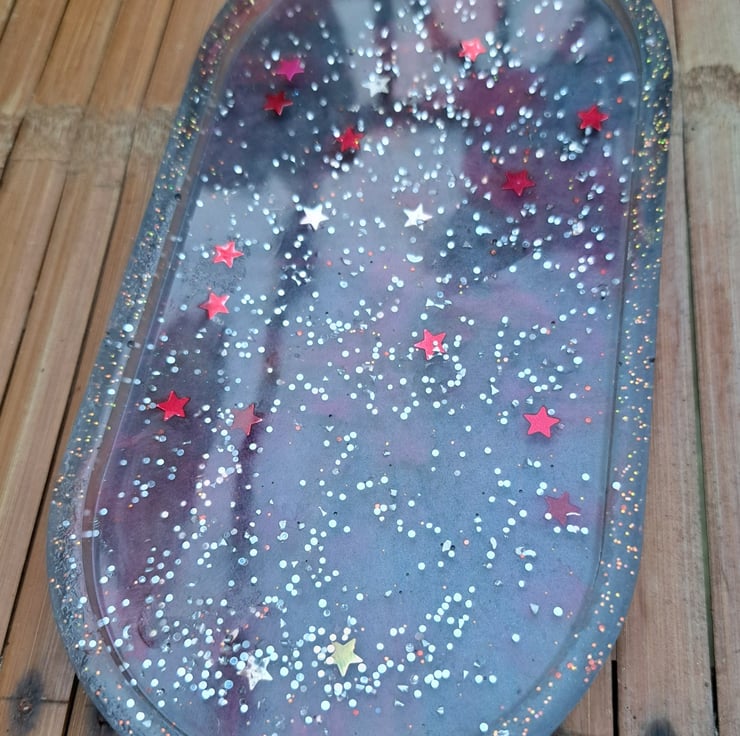 A lovely dark, sparkly, starry tray. Red and silver stars have been added to a red and black resin with sprinkles of glitter.