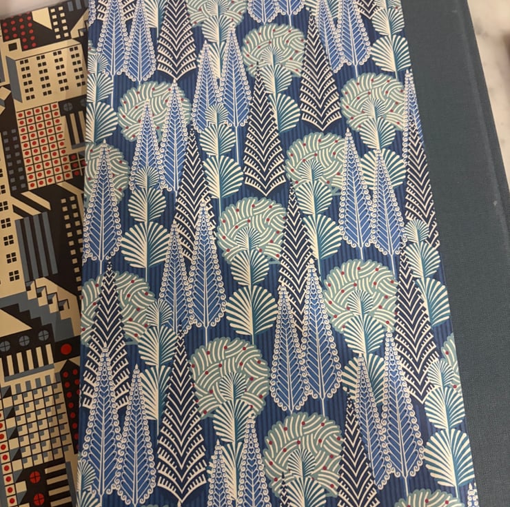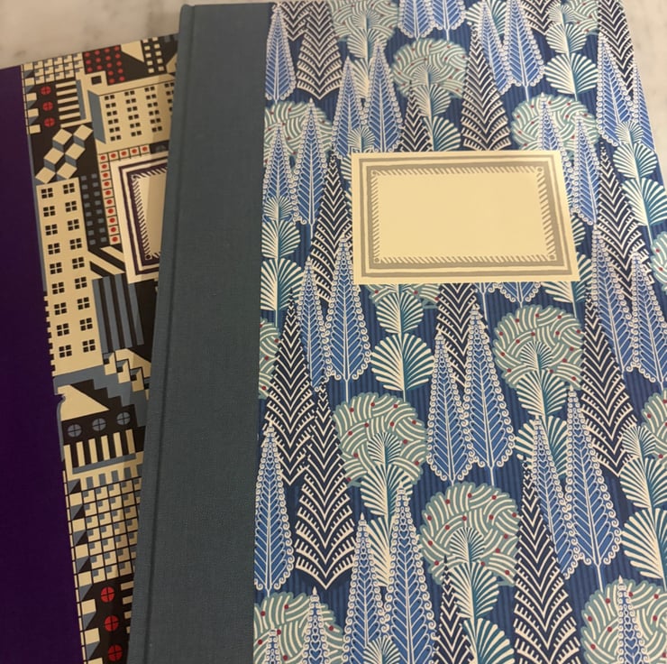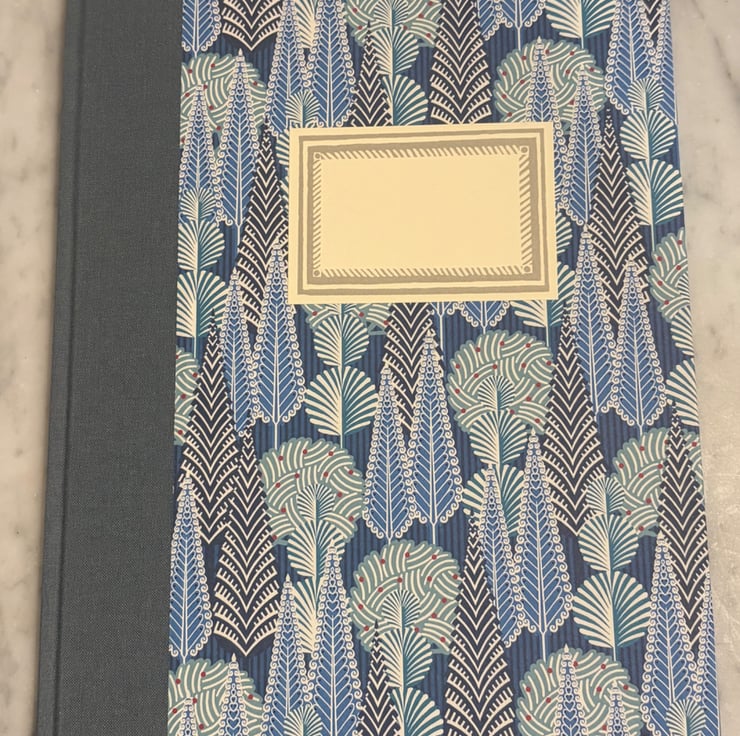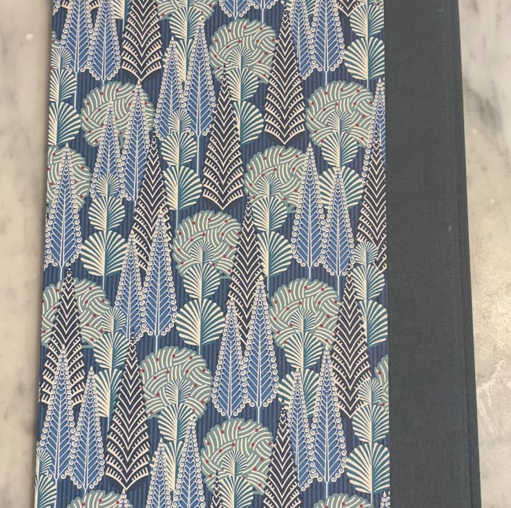 This one has a grey bookcloth spine and a striking tree design cover paper by the talented Cressida Bell. Finished with a smart label from Cambridge Imprint.