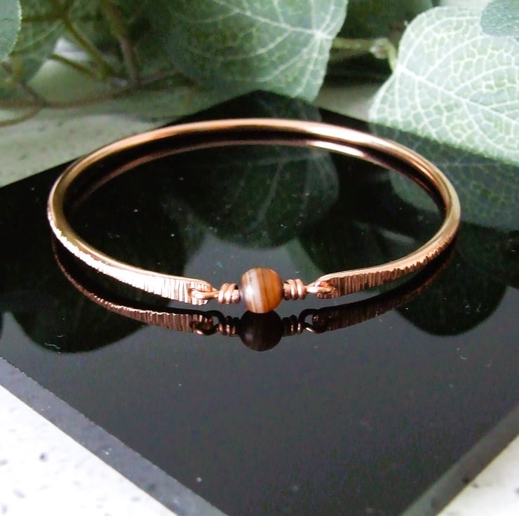 Hand forged copper and banded agate bangle. Size 20cms circumference, 6.3cm diameter. See bangle size guide photo.