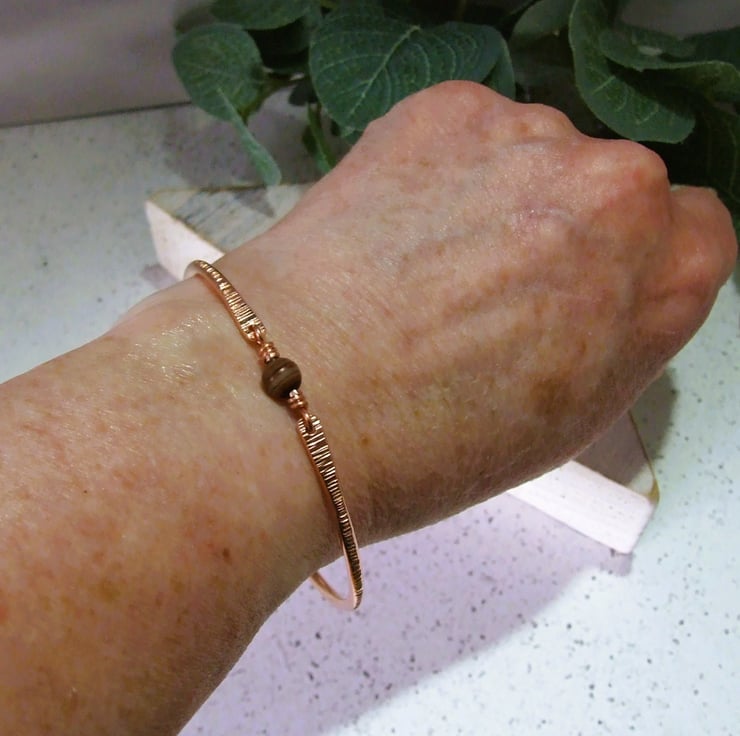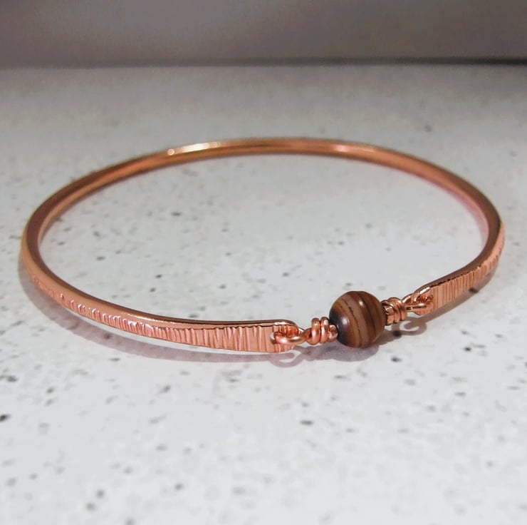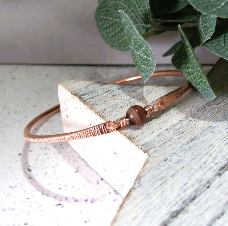 I have made the bangle from 2.5mm solid copper wire which I have flattened the ends and shaped and hammered to texture. At the centre of the bangle I have securely wire wrapped a 6mm banded agate gemstone bead. The bangle does not open and close and is designed to fit over your hand, please refer to the size guide photograph.