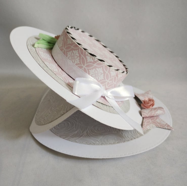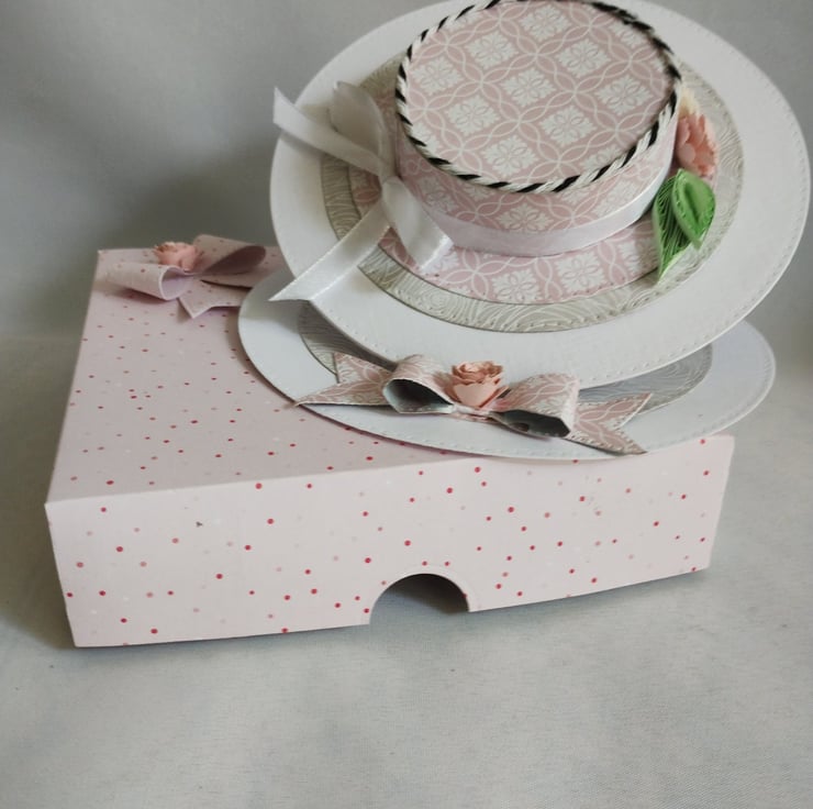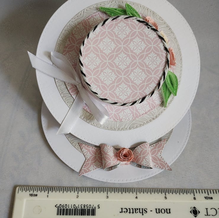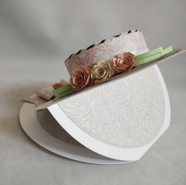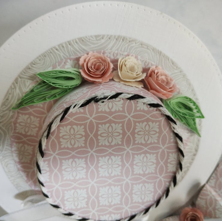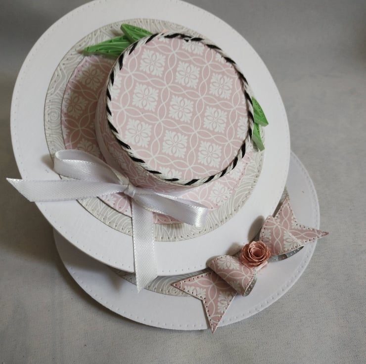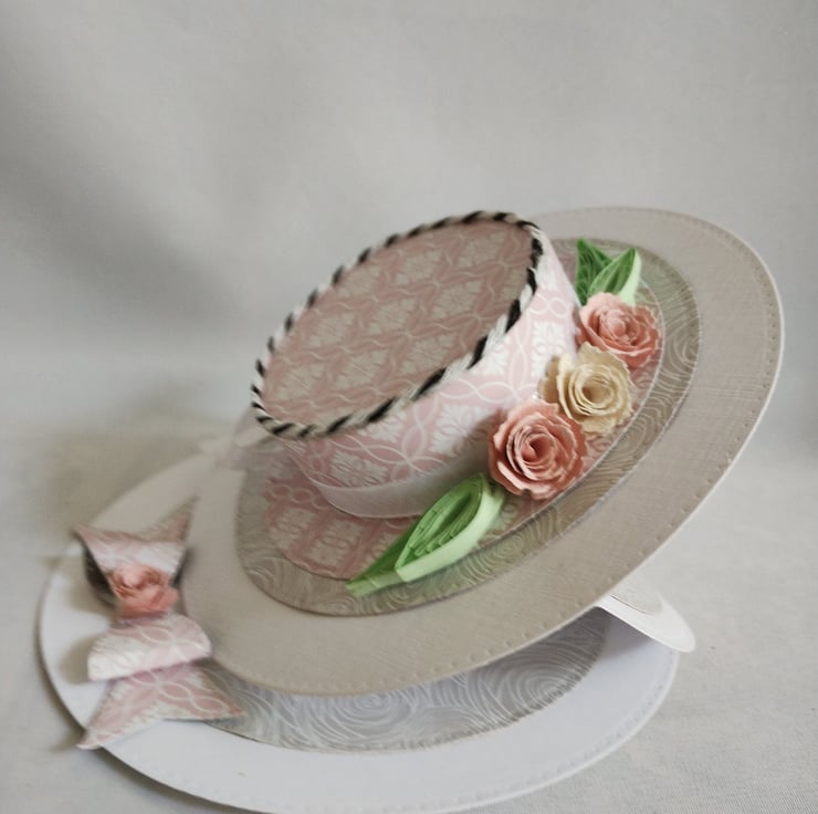 A beautiful floral hat is the feature of this easel card. I've made the hat from lovely pink cardstock, made roses and quilled leaves to decorate along with some pure white satin ribbon and black and white baker's twine for some contrast. I've made a cardstock bow from the same card as the 'stopper' and added another rose to the centre for extra interest and dimension.