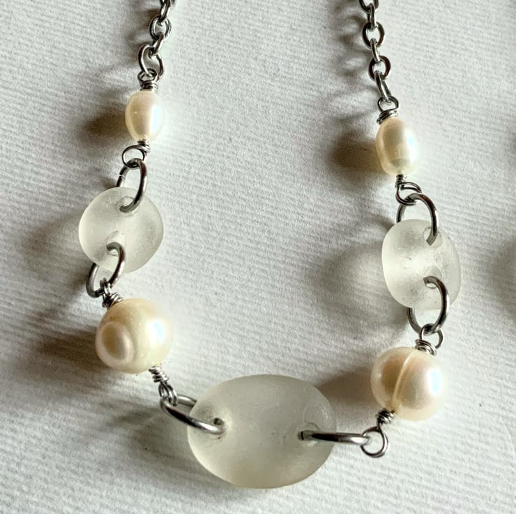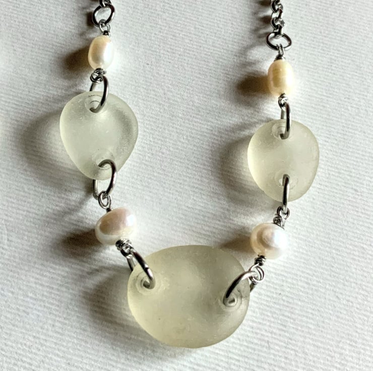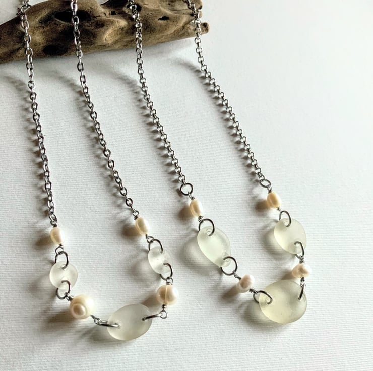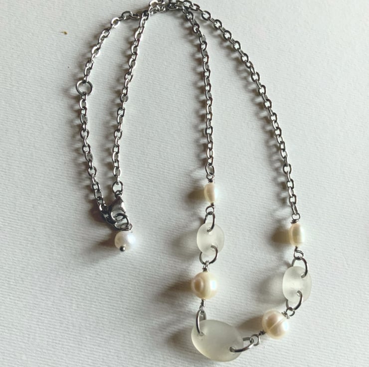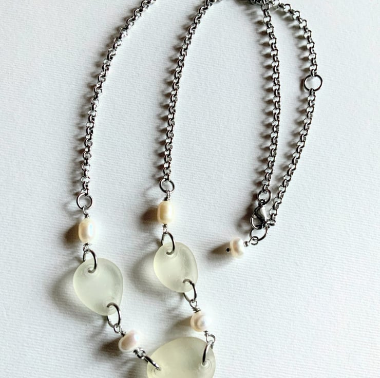 Seaglass & pearl necklace, made from three pieces of white, hand-picked seaglass from Seaham, teamed with four freshwater pearls, linked with stainless steel rings, hanging from an adjustable stainless steel chain. A lobster clasp closure with a freshwater pearl final completes the look.