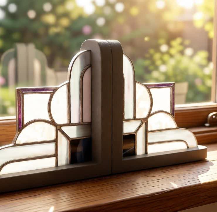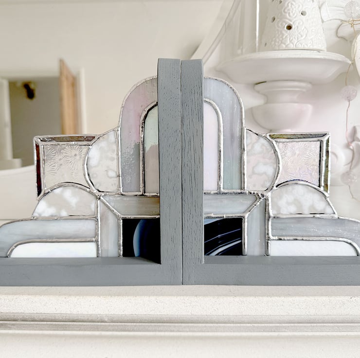 Art Deco Style stained glass bookends made from a mix of monochrome iridescent grey, iridescent white, mottled snow glass, rainbow dichroic and black streaky glass. The solder lines are bright silver.