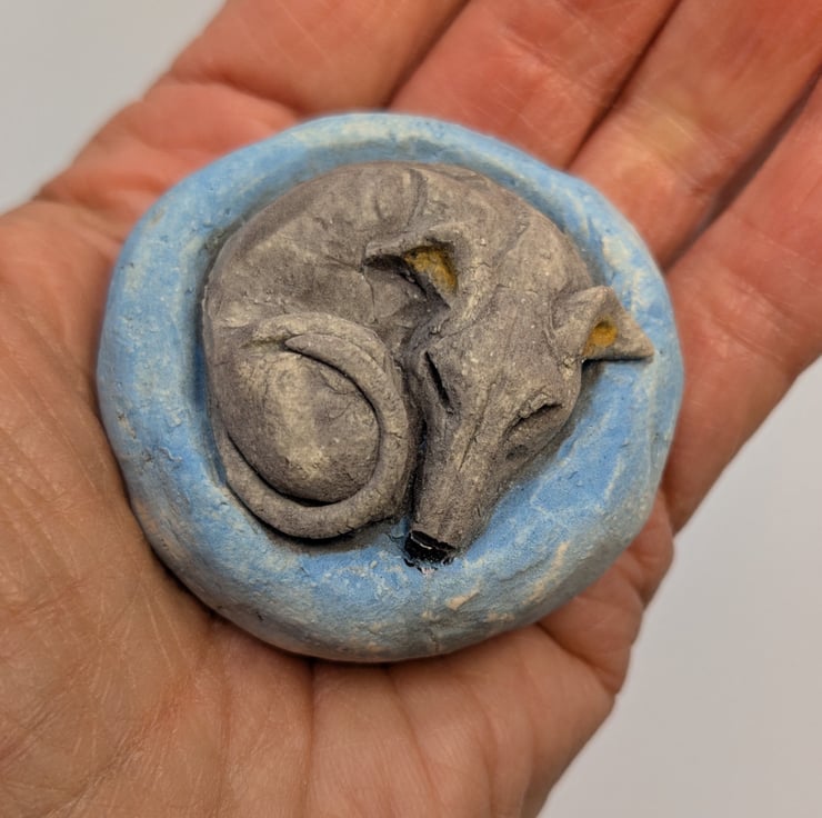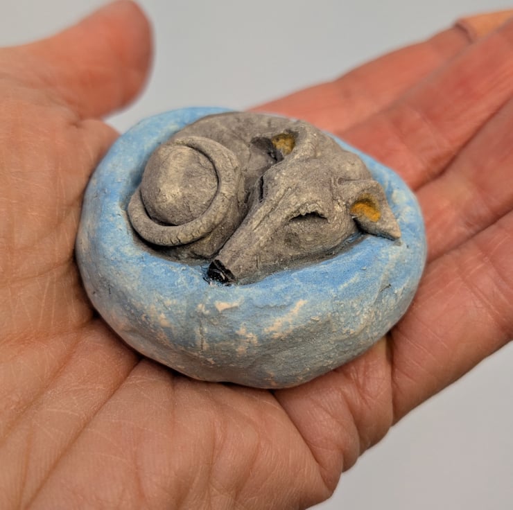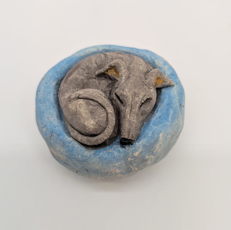 Miniature ceramic sculpture of a Whippety type in a Yorkshire Pudding shaped bed!