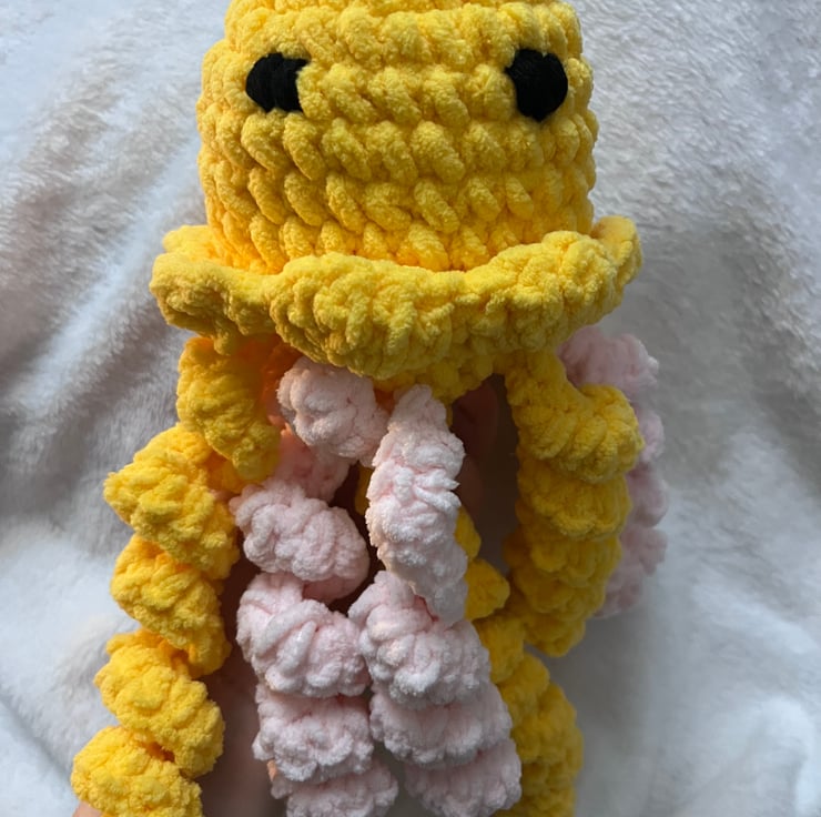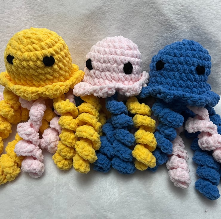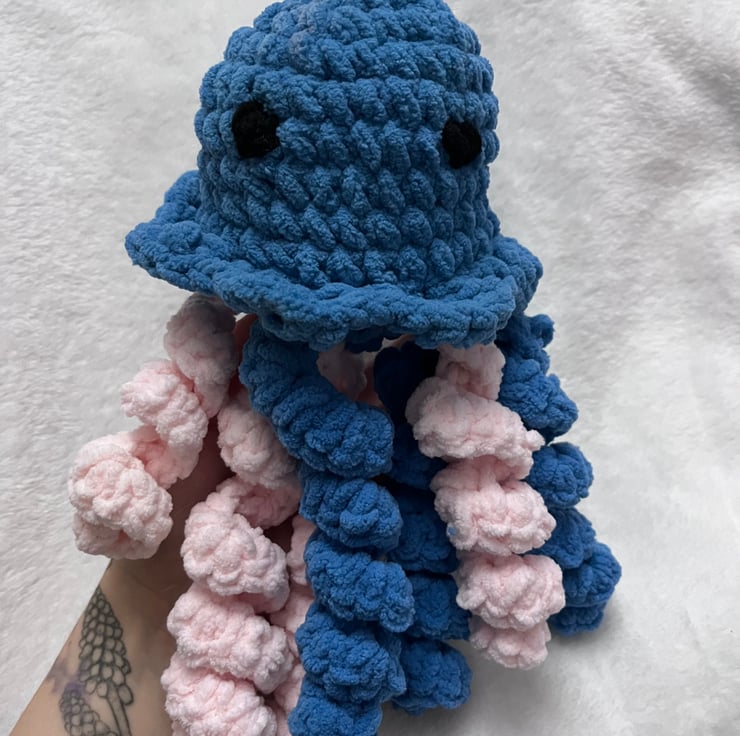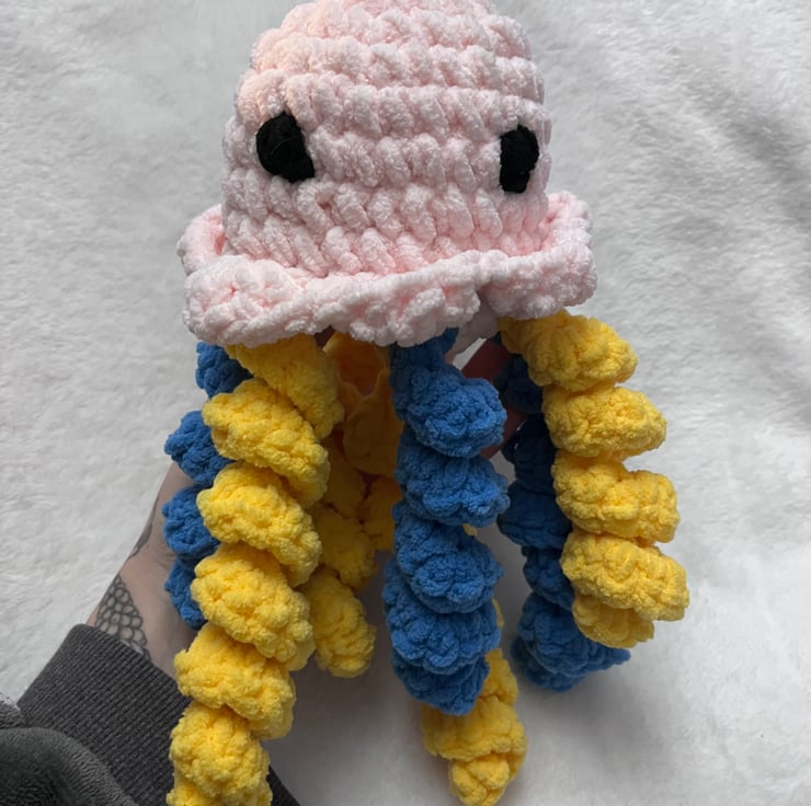 This handmade crochet jellyfish plush is created with ultra-soft chunky yarn for a cozy, squishy feel. Each one is carefully crafted by hand, giving it its own unique personality — perfect as a comfort plush, nursery decor, or thoughtful gift for little ones.