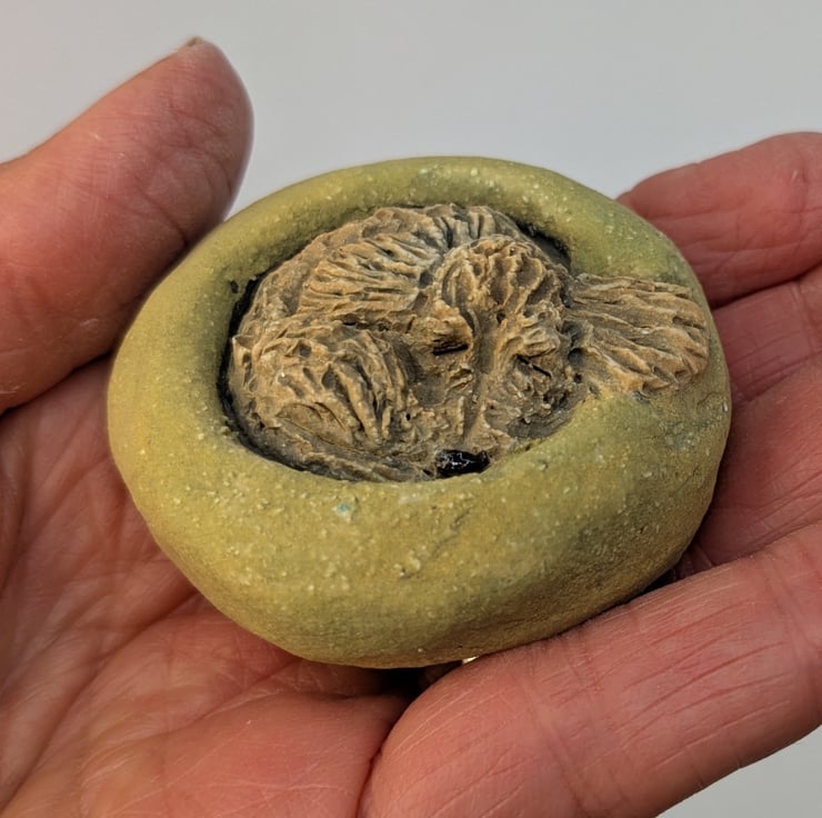 Miniature ceramic sculpture of a Cockerpoo in a Yorkshire Pudding shaped bed!