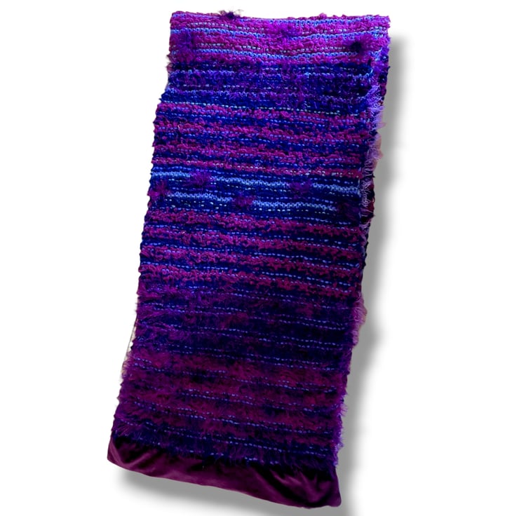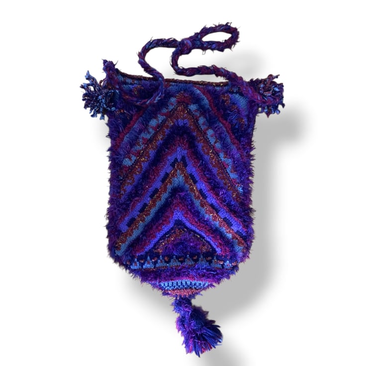 A one of a kind handknitted shades of purple bag and matching scarf, one of many I made when I belonged to a craft group at an art gallery. These have been in storage for a long time but are still as good as new. The bag is pointed and tassled and is lined with plum velvet and the scarf is very long and has velvet edges.
