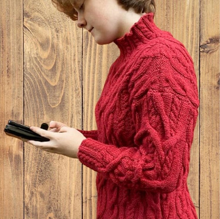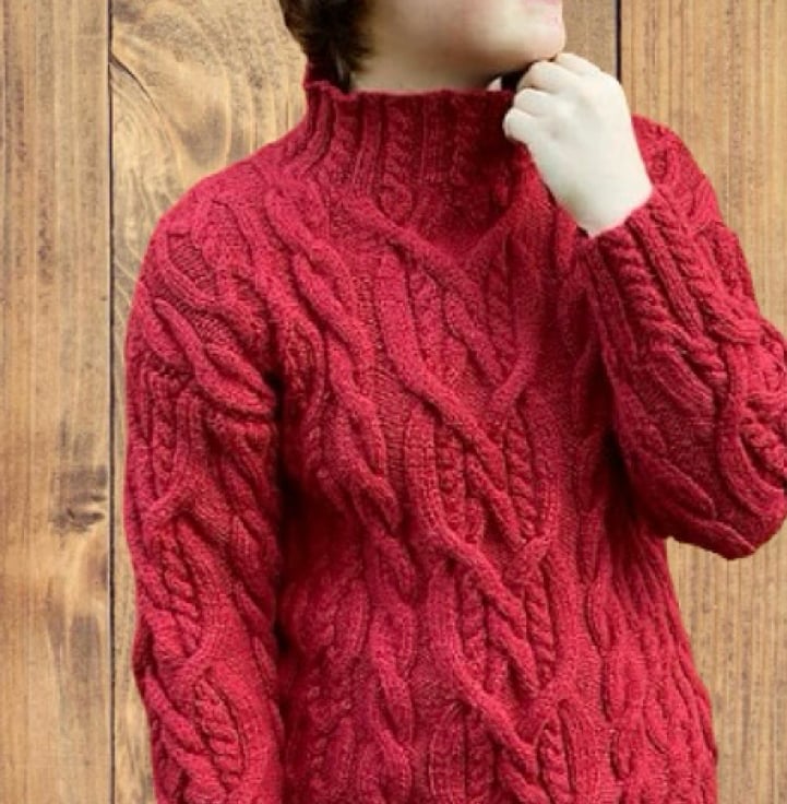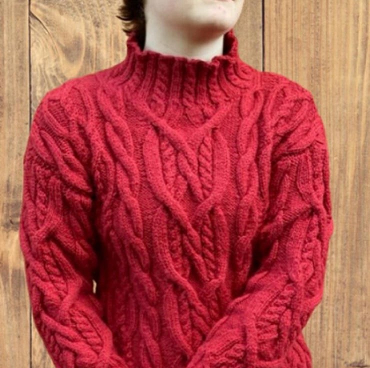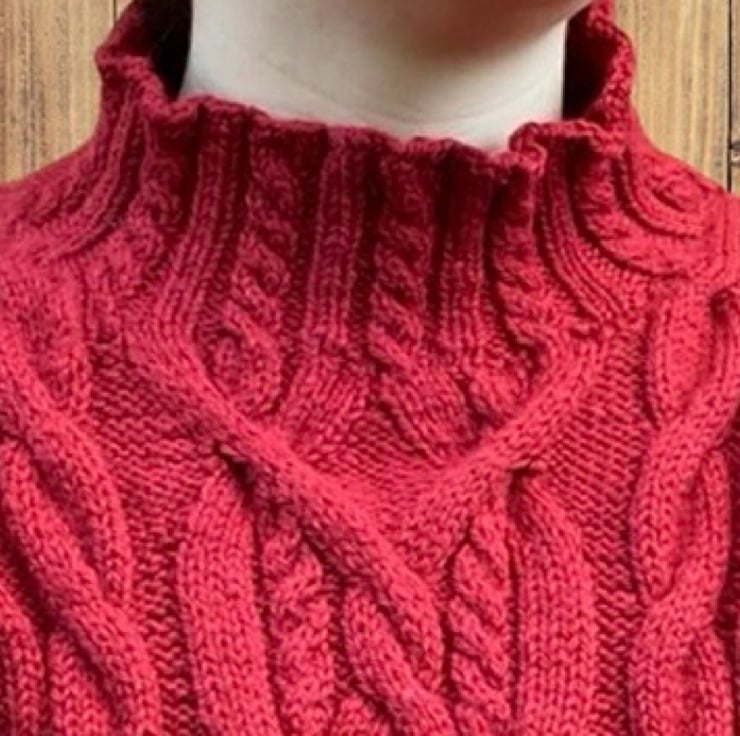 The stand up collar has a cable twist and purl combination design as have the long sleeve cuffs and lower edge