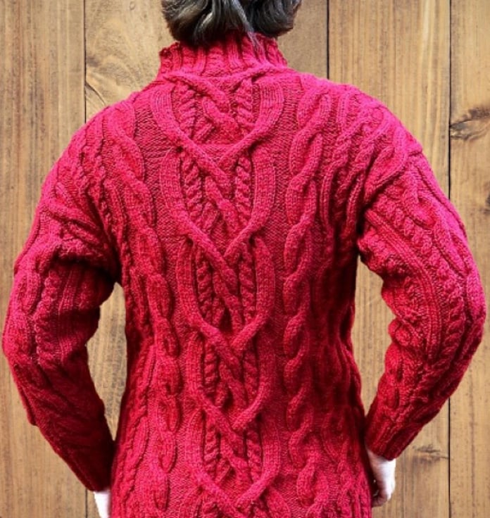Hand Knitted Cable Pattern jumper in a blend of Alpaca 35% with Wool 65%, this long line sweater has an intricate cable pattern back and drop sleeves .