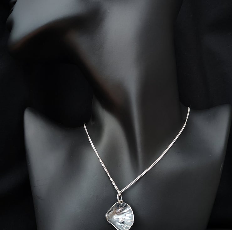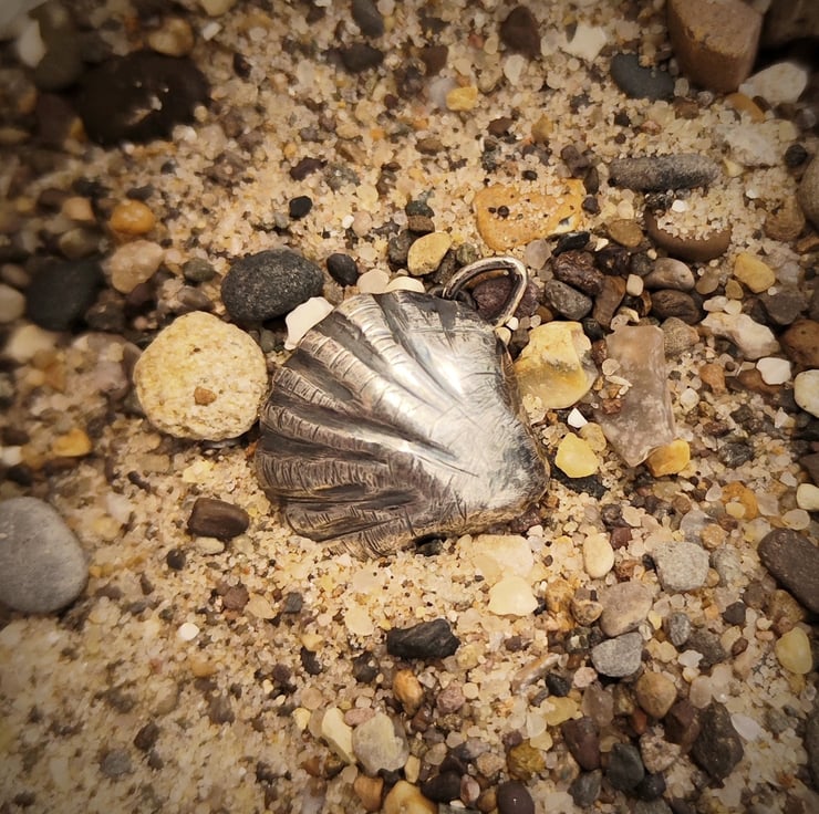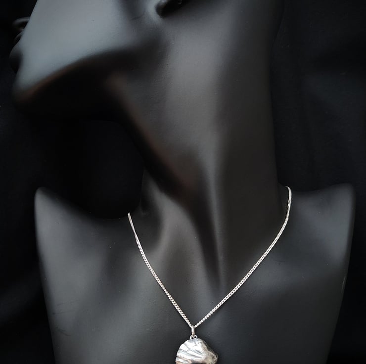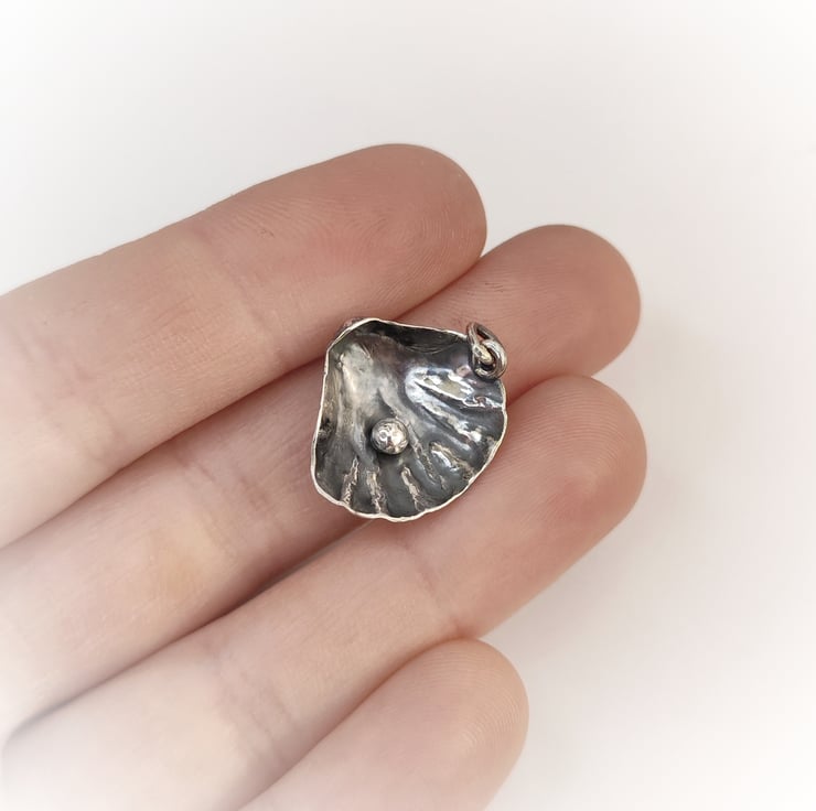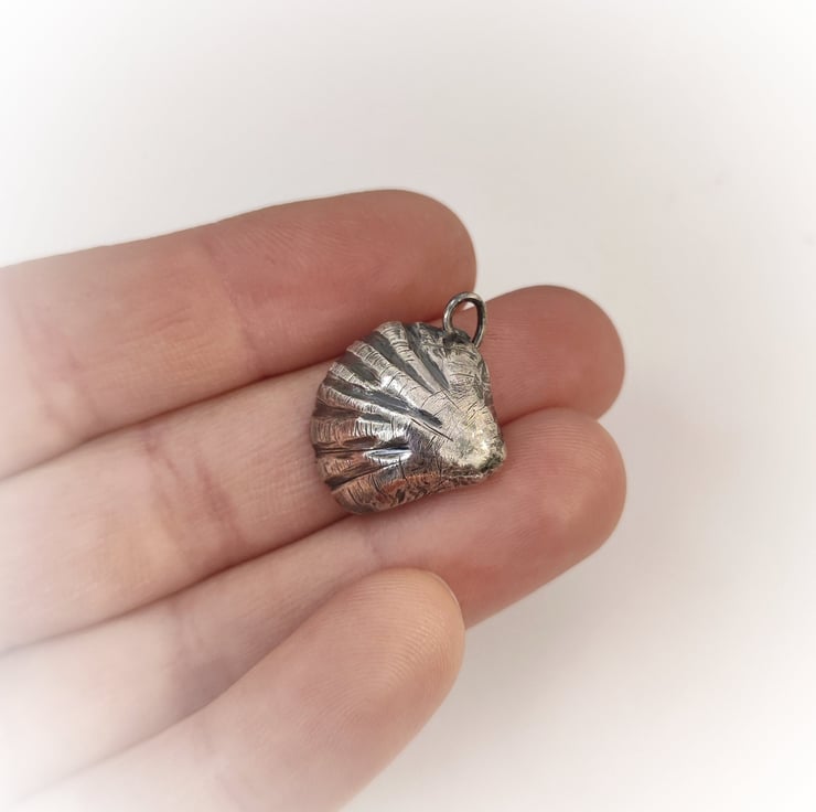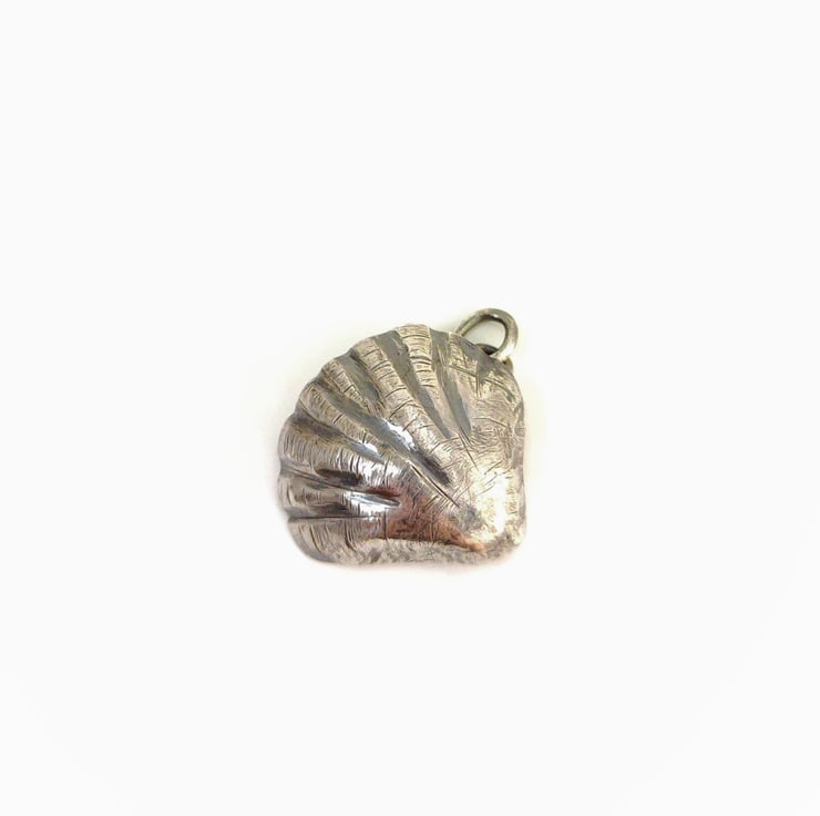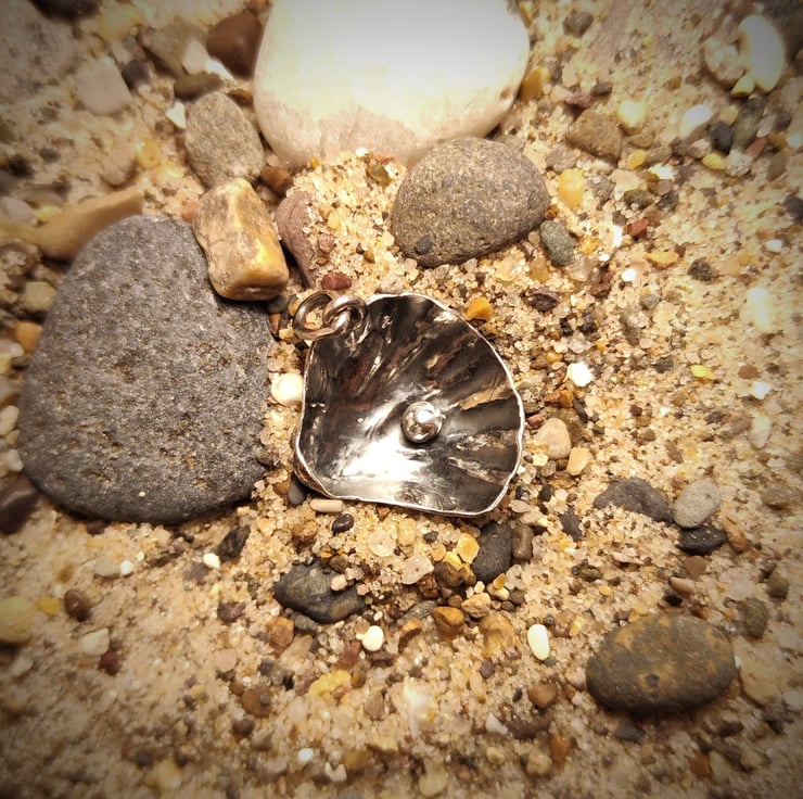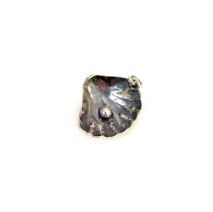 Unique small sterling silver shell pendant. It is made of silver sheet formed on domed stakes and then various tools to achieve sea-worn effect. Inside features small silver 'pearl' to add interest. Patinated to add to old effect.