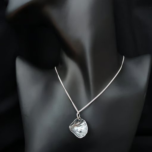 Unique small sterling silver shell pendant. It is made of silver sheet formed on domed stakes and then various tools to achieve sea-worn effect. Inside features small silver 'pearl' to add interest. Patinated to add to old effect.