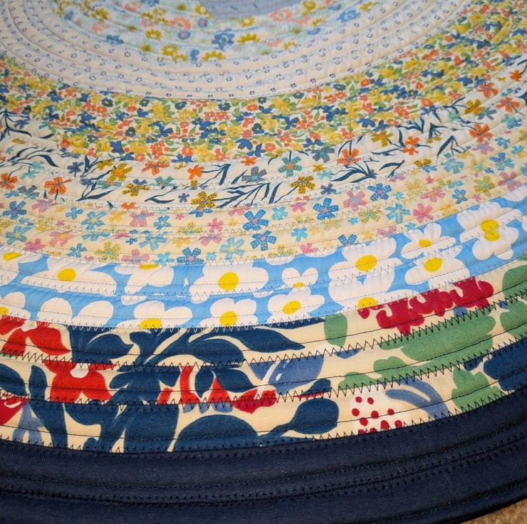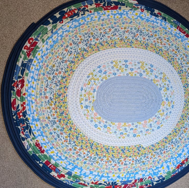 Oval shaped. Original jelly roll rug 39.5" x 36" (100.5cm x 91.5cm) approx.