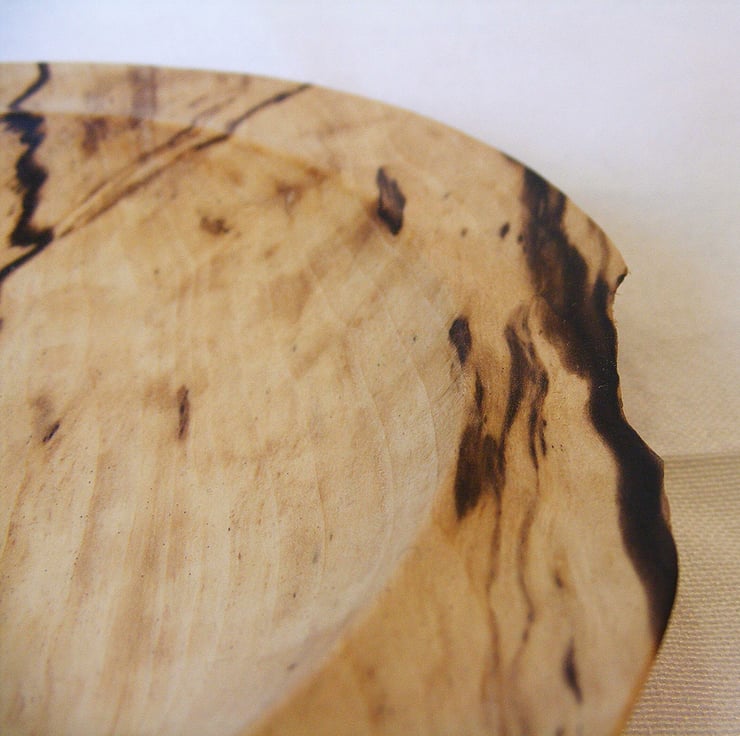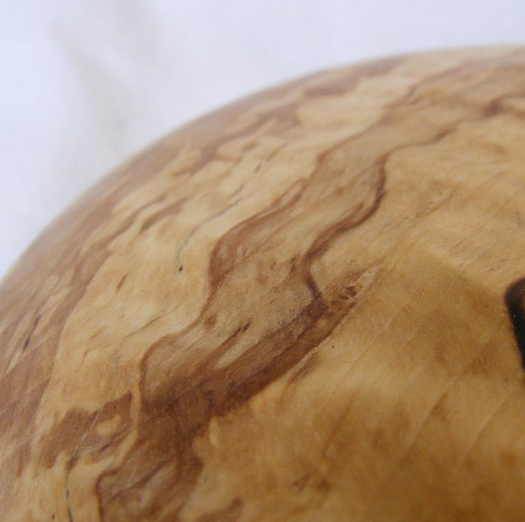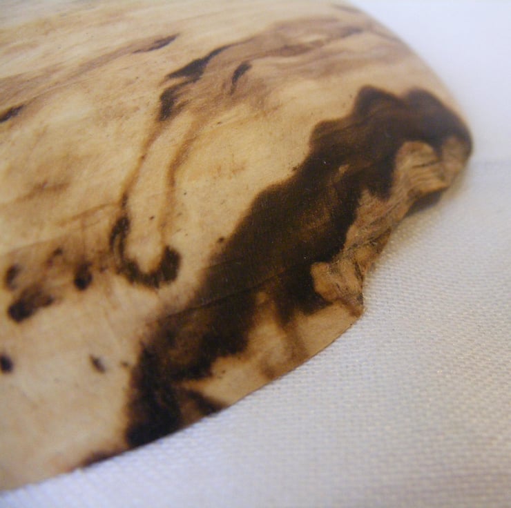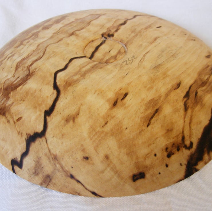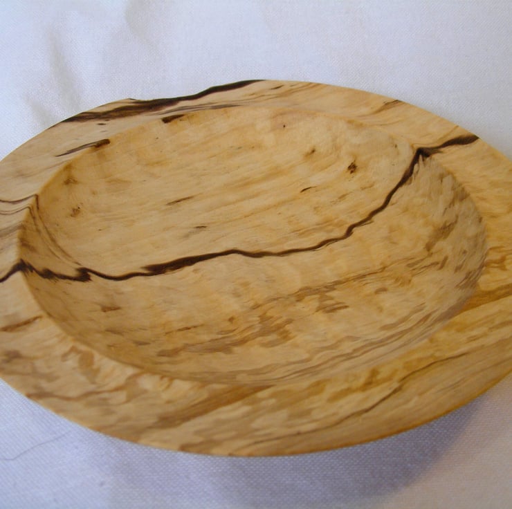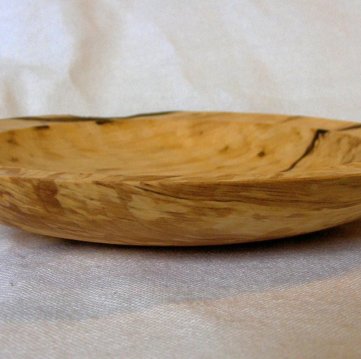 A small spalted Hornbeam bowl, 160 x 25mm. A shallow bowl with a flat rim that has a slight ridge round the inner edge, with one section of natural edge. The timber is lovely with a cream background, light brown areas shot through with black streaks, the grain also has a slight ripple to it. It is food safe so could be used with food or as a decoration.
