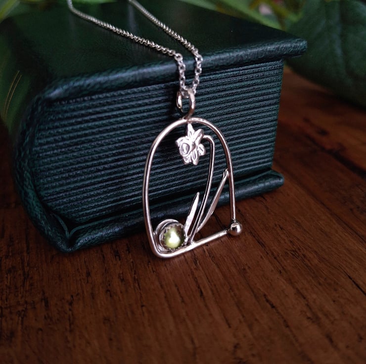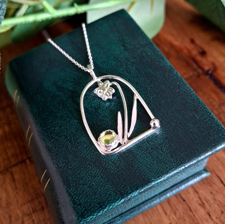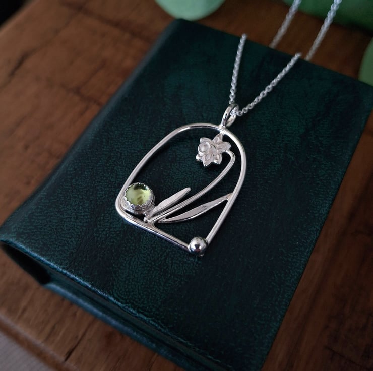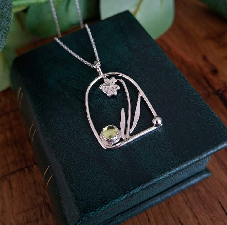 The arch pendant is a little under der 1inch big and made with Fine Silver (99.9% silver) as well as Sterling Silver, the 20" long chain is made with Sterling Silver, the fresh green Peridot is 5mm big.