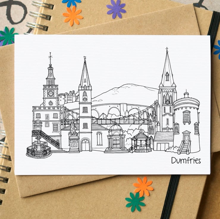 A blank card featuring a skyline illustration of some of the most recognisable landmarks in Dumfries, Scotland.