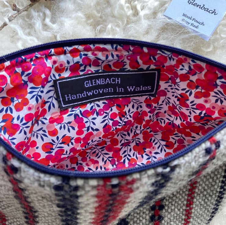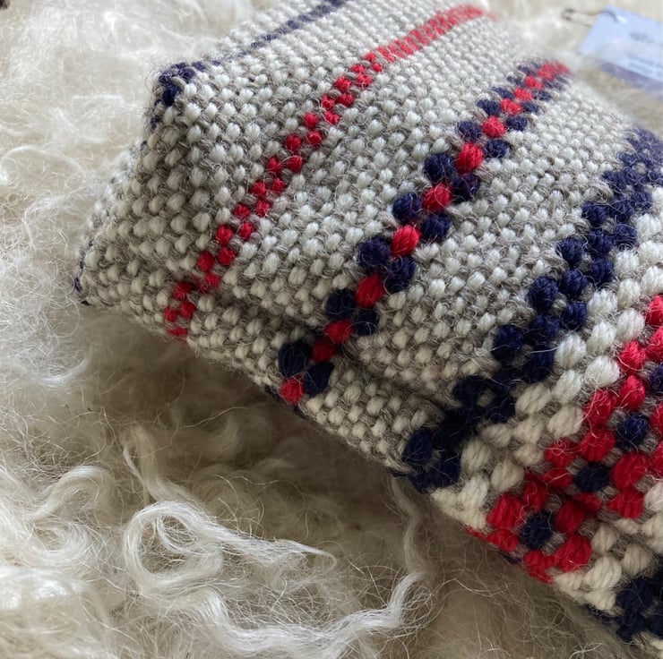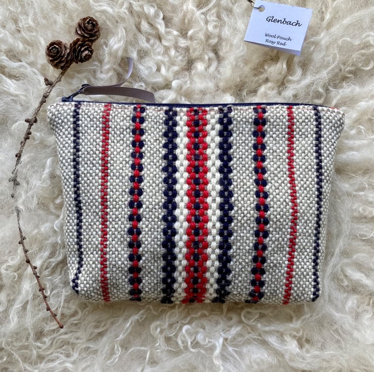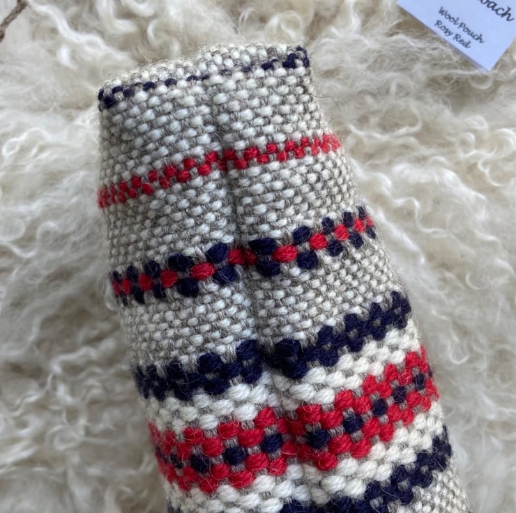 Our Wool pouch is handwoven using natural grey and ecru wool with a dash of rosy red and navy - all British wool.
