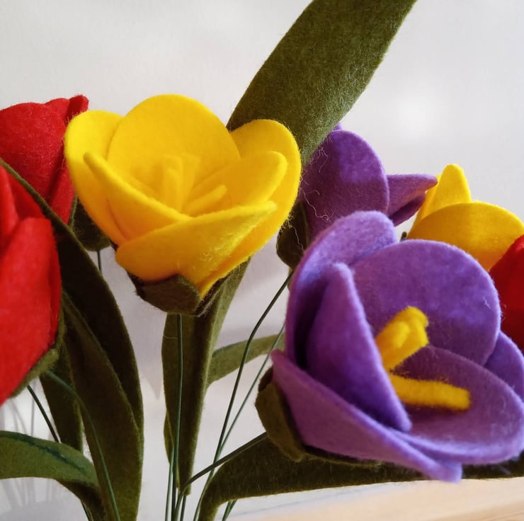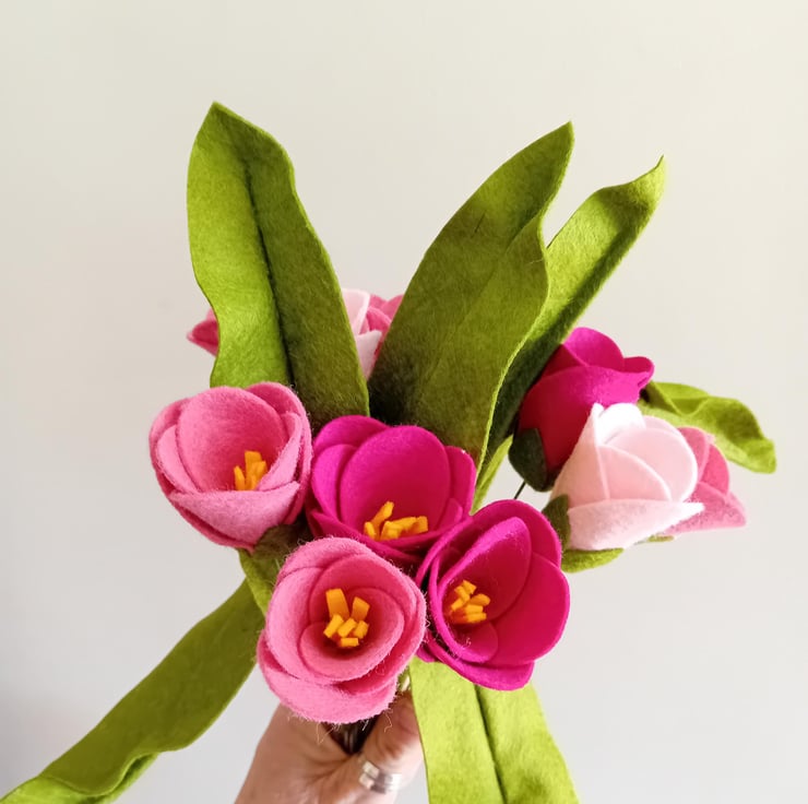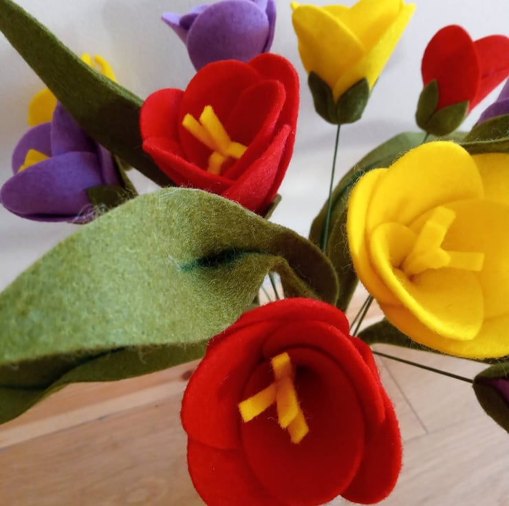 Every felt tulip is handmade with care and attention to detail. With 12 stems and 6 leaves in each bouquet, you can perfectly tailor your order to your desired colour scheme.