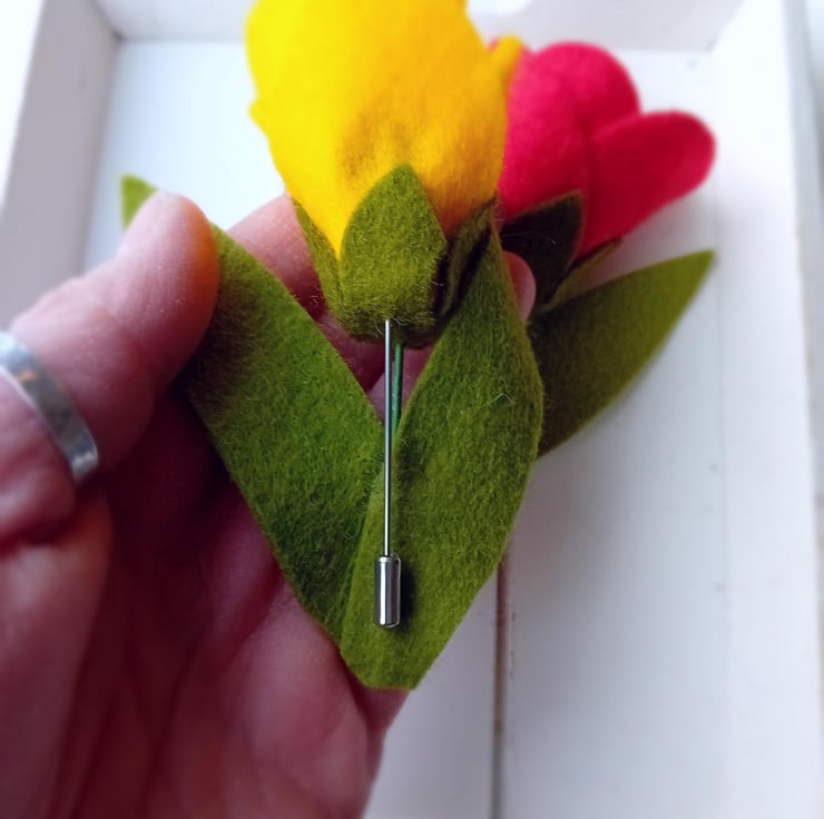 Measuring between 4" - 5" in height, this eye-catching piece features a convenient buttonhole pin for secure attachment, making it the perfect finishing touch for jackets, blouses, or bags. Whether you're dressing up for a special occasion or adding flair to your everyday wear, the Tulip brooch is sure to turn heads.